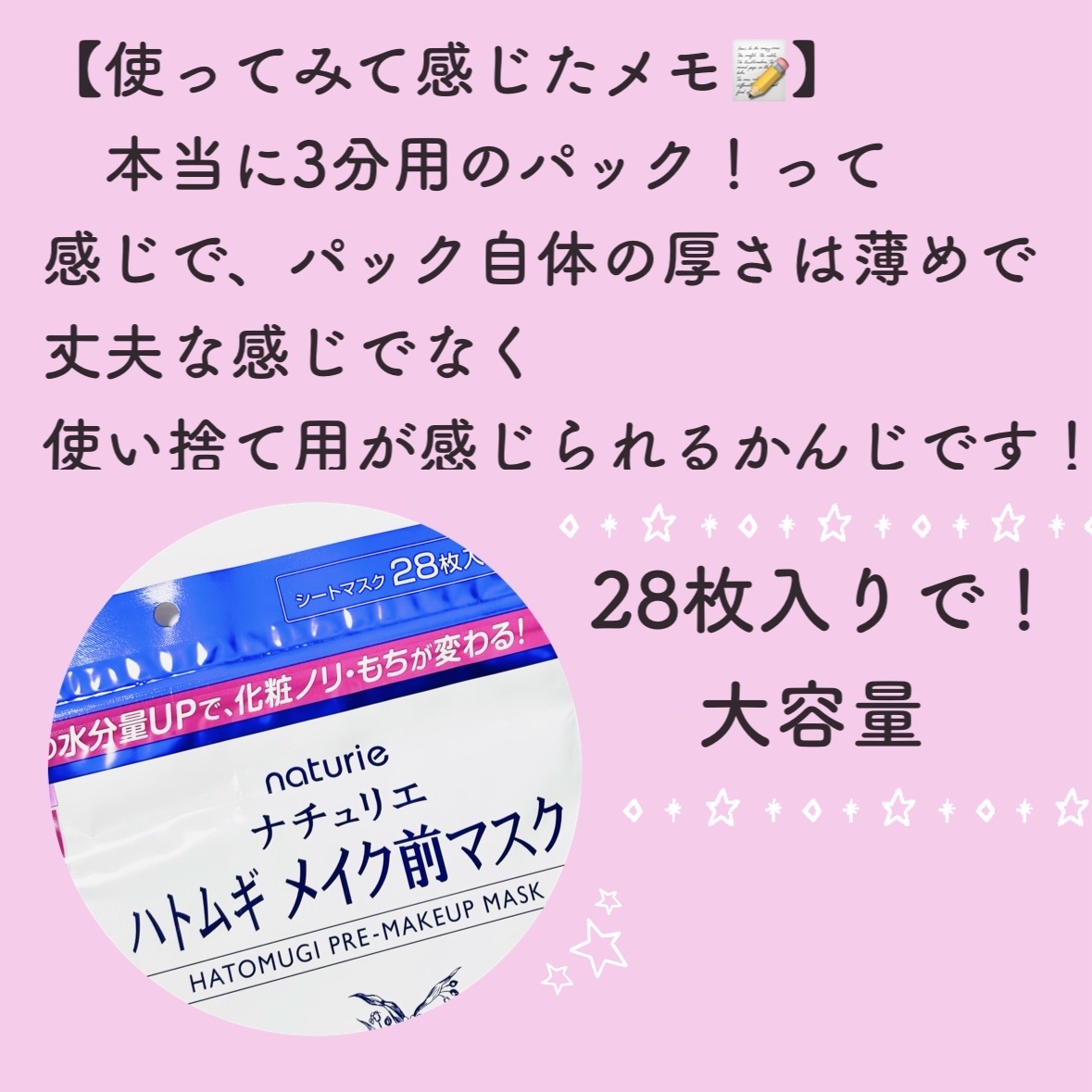 ナチュリエさまからいただきました!🔵ナチュリエ ハトムギメイク前マスクシートはかためで少しごわつく質感だから密着しにくくて貼るのに多少手間取る🤔サイズは大きめだから、全顔覆いやすい✨液はたっぷりヒタヒタなんだけどその分?少し液ダレしやすかった...