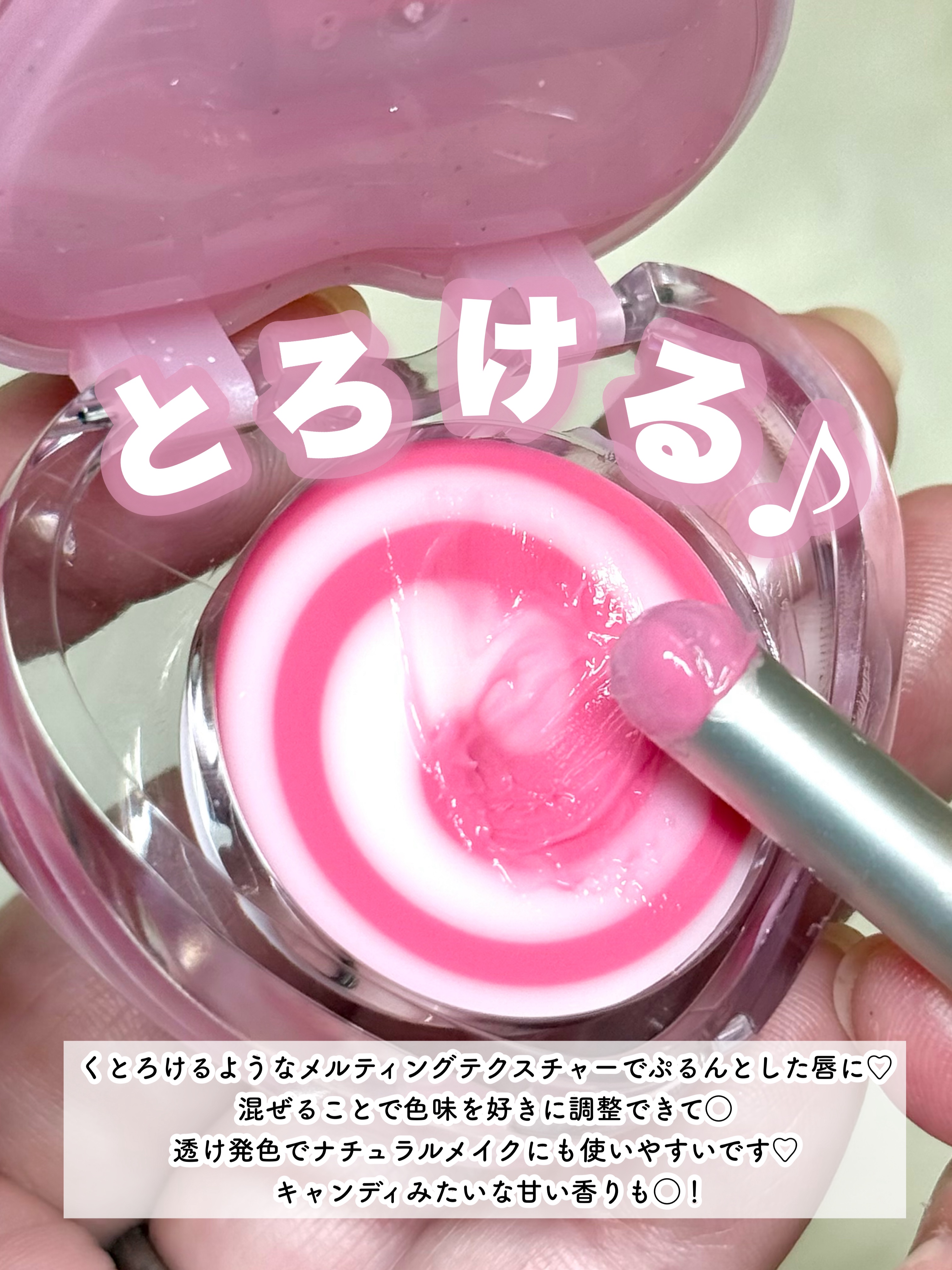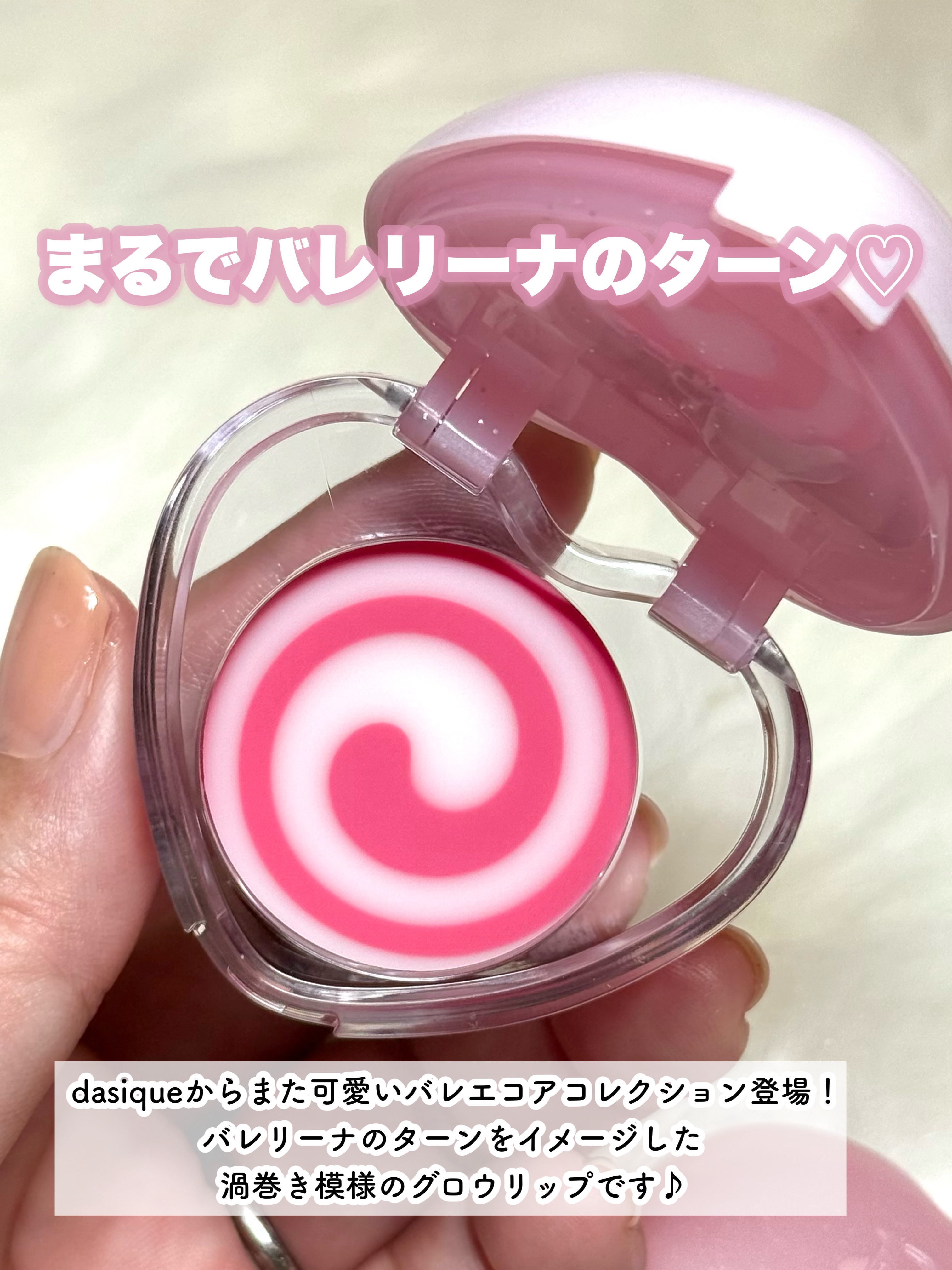 - 【舞台上のバレリーナの繊細な動きと抑制された美しさを再解釈した、dasiqueならではのバレエコアコレクション】 バレリーナの最後のターンのように優雅に舞うホワイト&ピンクカラーが澄んだ輝きと自然なツヤをプラスしてくれるグロウリップ。 #キャンディローリングポット #ピンクピルエット #デュアルミキシングバーム #メルティンググロウテクスチャー #すっぽりハートポット ✓ バレリーナのエレガントなターンを思わせるスワール模様を閉じ込めたキャンディローリングポット。 ✓ とろけるようなメルティングテクスチャーとうるおい成分を配合し、透き通るようにぷるんとしたグロウリップを演出。 ✓ スイートでラブリーなハートパッケージ。