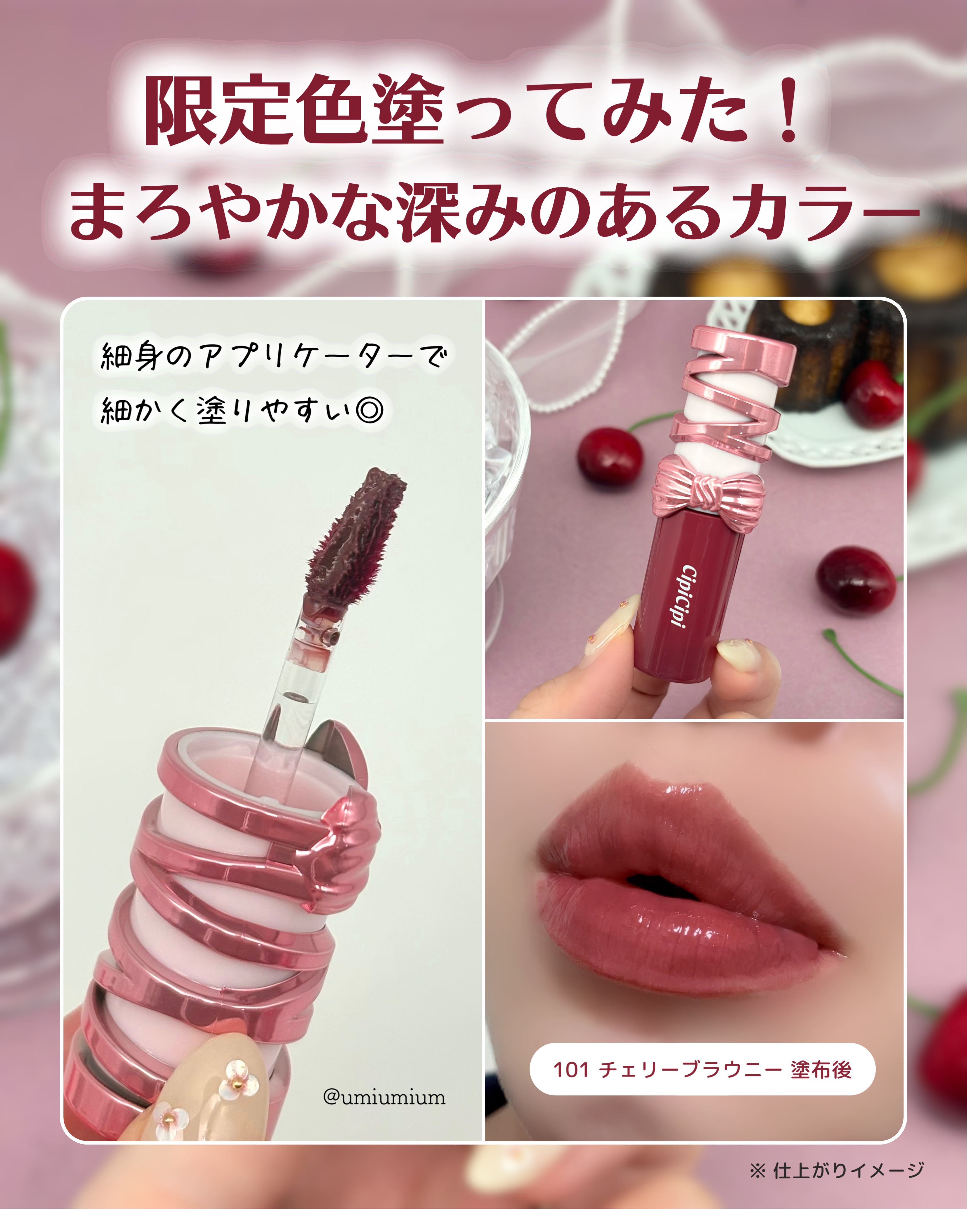 バズりまくったCipiCipiのリボンティントから冬の限定色が登場⛄️🍒⚜️CipiCipiシピシピデューイフィルムティントR101チェリーブラウニー101チェリーブラウニーは深みのあるチェリーブラウンカラーで大人っぽい冬メイクの主役にも!!...