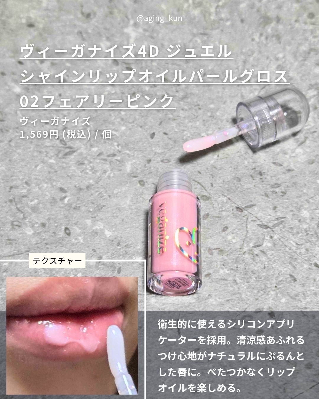 💖𝘃𝗲𝗴𝗮𝗻𝗶𝘇𝗲@veganize_jp𝟰𝗗𝗝𝗘𝗪𝗘𝗟𝗦𝗛𝗜𝗡𝗘𝗟𝗜𝗣𝗢𝗜𝗟チラチラ光るパールが可愛いリップオイル💖リップの仕上げとしてはもちろん、ベースのカラーもしっかりしているのでニュアンスチェンジとしても使えるよ◎スースーするタ...