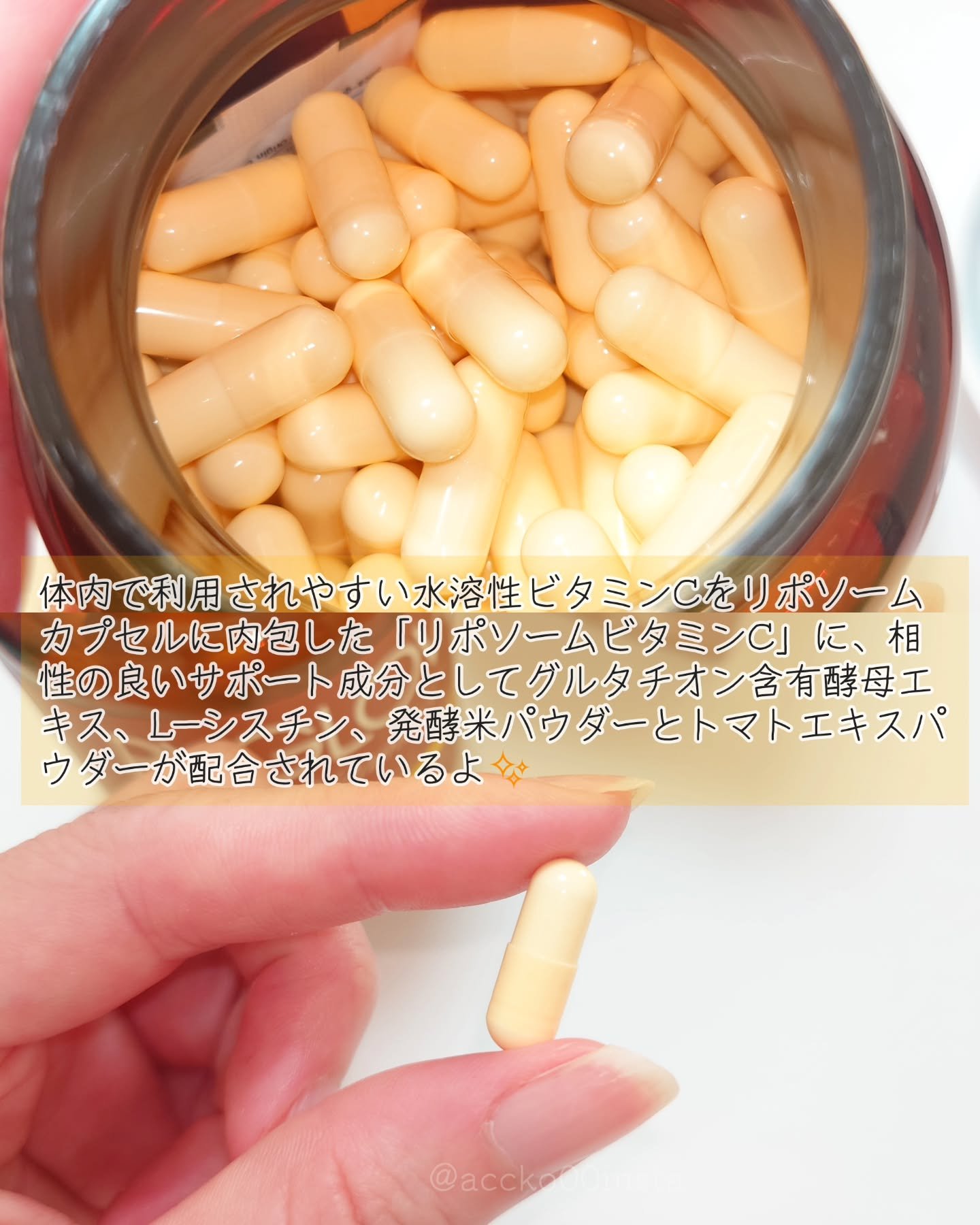 - リポソームビタミンC×グルタチオン×L-シスチン(グルタチオン含有酵母エキス) 飲む、透明感。満たされる毎日。 体内で利用されやすい水溶性ビタミンCをリポソームカプセルに内包した「リポソームビタミンC」に、 相性の良いサポート成分としてグルタチオン含有酵母エキス、L-シスチン、発酵米パウダーとトマトエキスパウダーを組み合わせて配合。飲みやすい小さなハードカプセルにぎゅっと詰め込みました。お出かけ前にも仕事の合間にも、毎日の習慣できれいをサポート。