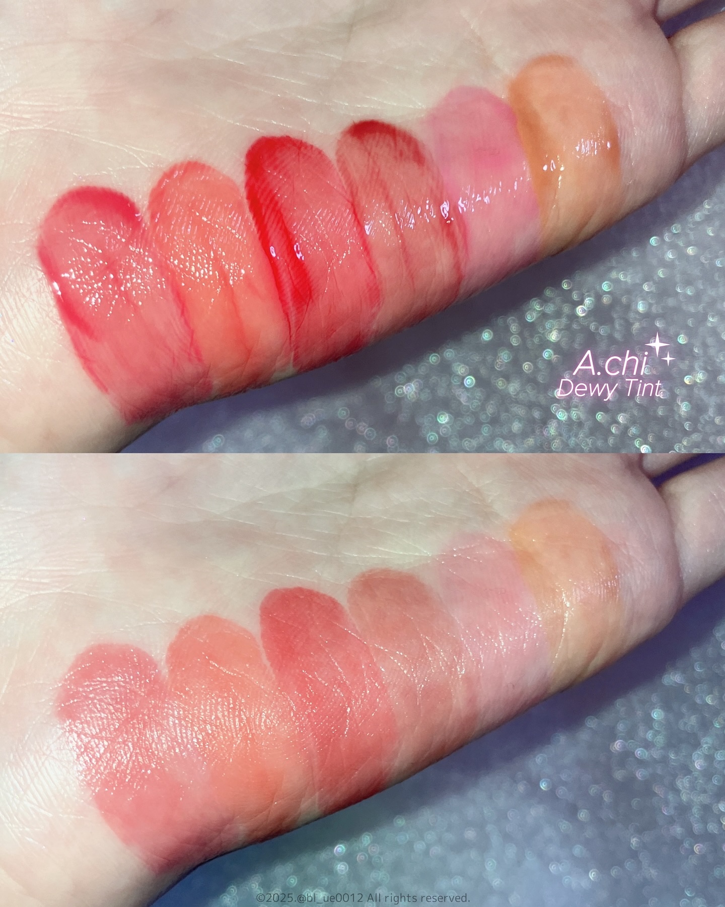 A.chi【デューイティント全6色】みずみずしくてツヤ感がかわいい💖クリアな発色でスルスル塗れるよ!既存色の01/02番はベースカラーで03/04/05/06番はポイントカラーに💡組み合わせてグラデーションにも◎#PR#Achi#HEMEKO...