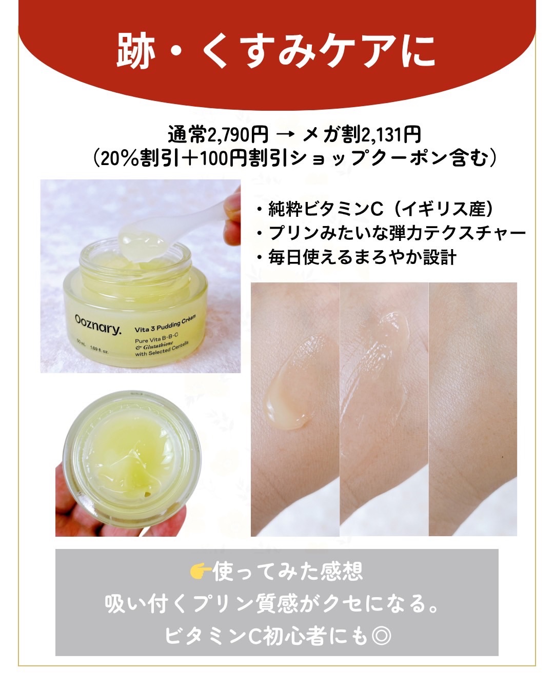 \メガ割必見アイテムまとめ/詳しくは画像をチェックしてね!Ooznary▶ビタ3プリンクリームプリンみたいなぷるぷる密着クリーム♡澄んだ印象の肌へ導く優秀アイテム👏これ使用感お気に入り♥️クーポン適用前:2,790円→クーポン適用後:2,...