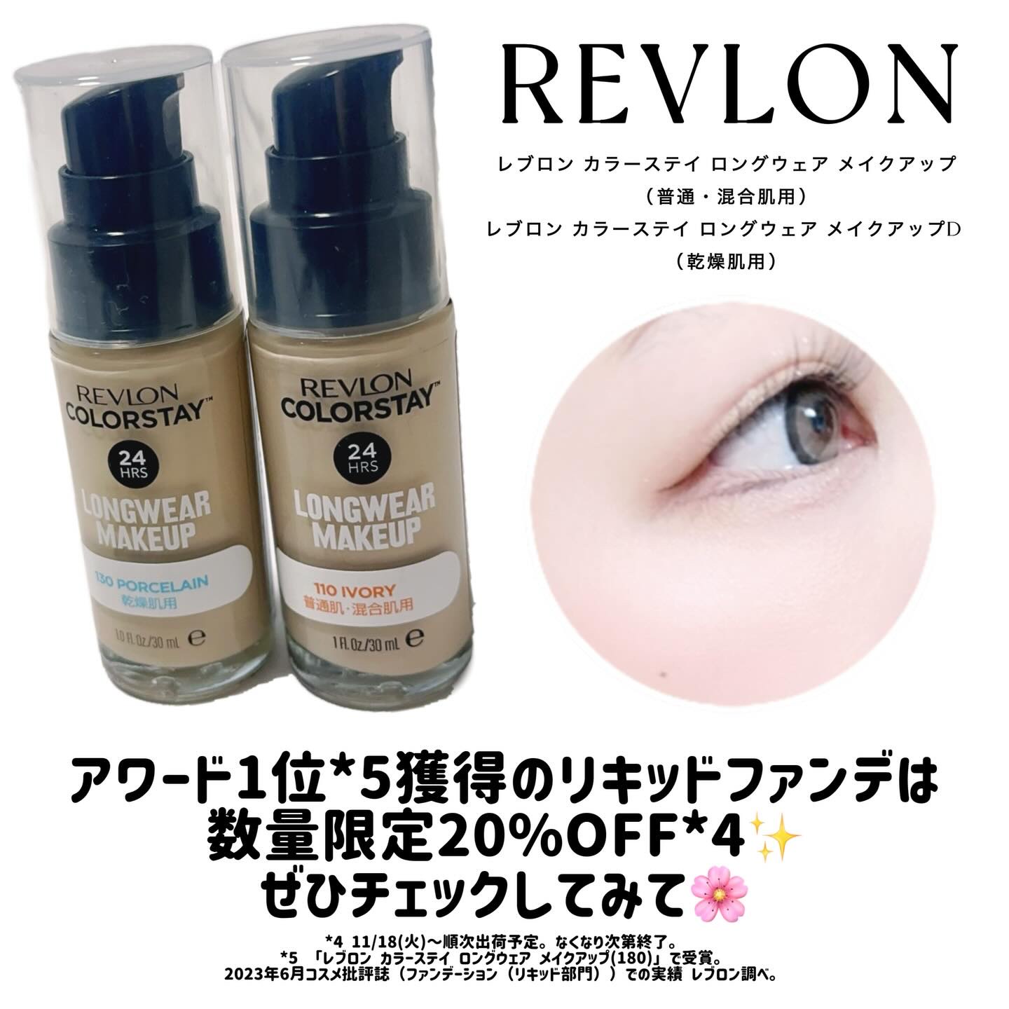 \24時間*1くずれ知らず素肌感を格上げ✨/アワード1位*2を受賞したあの【レブロンカラーステイロングウェアメイクアップ】が、数量限定で今だけ20%OFF*3に!💄肌タイプに合わせて選べる2種類👇✔普通・混合肌用(さらっと仕上げでテカりにくい...