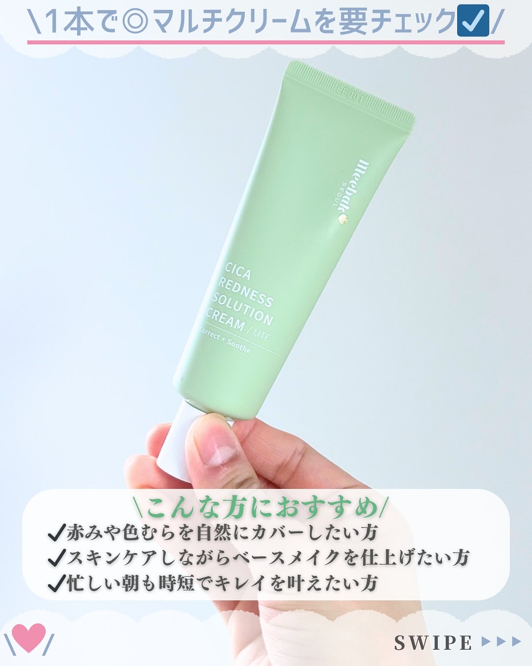 *Meebak▷CICAレッドネスクリームライト 2,800円(税込)4種の美容成分を配合し、素肌をいたわりながら美しく仕上げる「スキンケア発想のうるおい下地」グリーンからベージュに自然に変化し、気になる肌の色ムラをカバーCCクリームやスポッ...