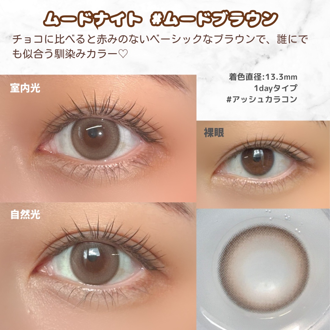 大人っぽく雰囲気のある目元を演出する アッシュカラコン〖ムードナイト〗シリーズ☾˖° 自然に溶け込むグラデーションフチとアッシュ系カラーの組み合わせで落ち着いた大人なムードに𓈒𓂂𓏸 しっかりおしゃれに盛れるのに、ナチュラルで場面問わず使いやすい絶妙さが◎