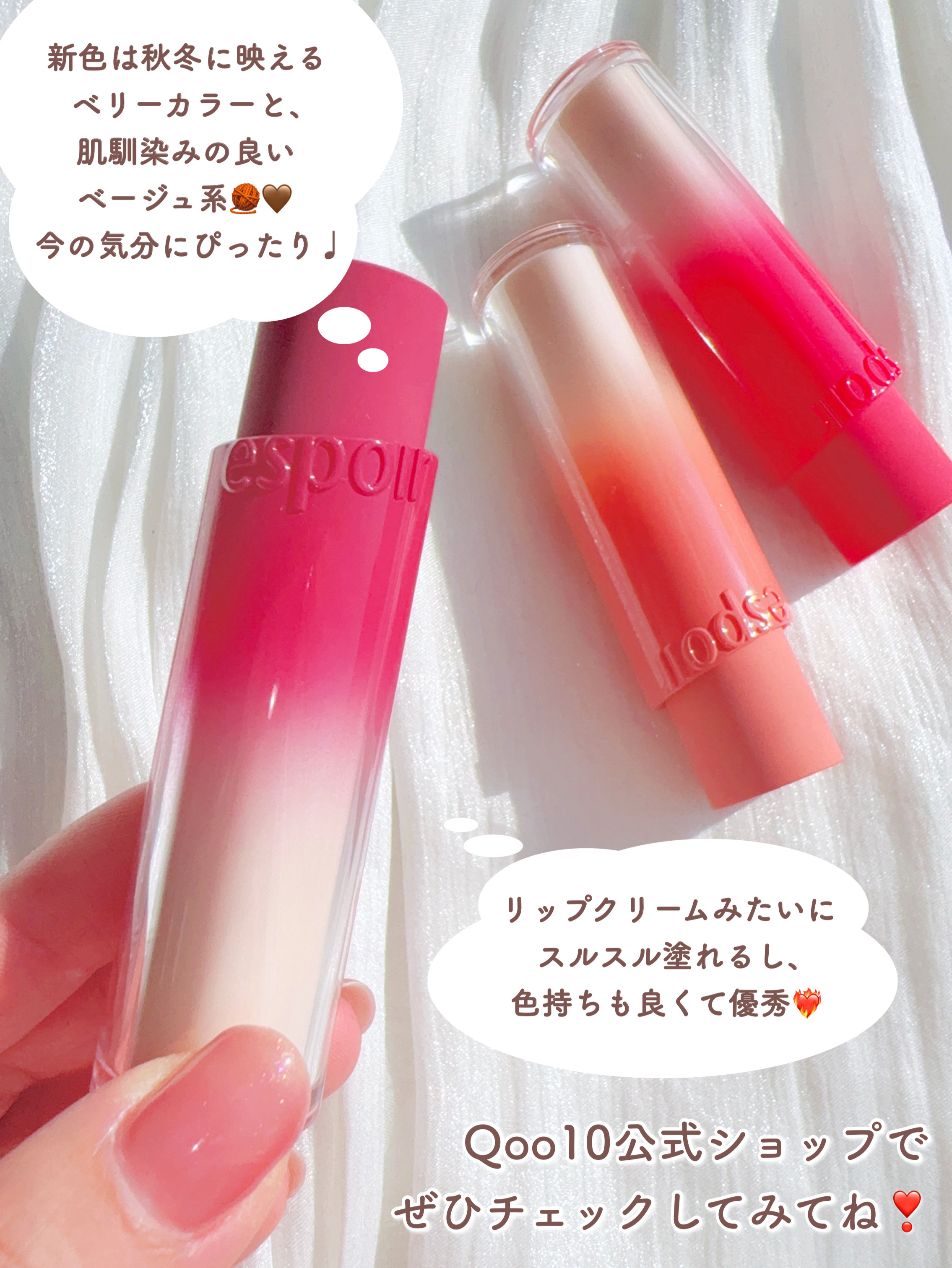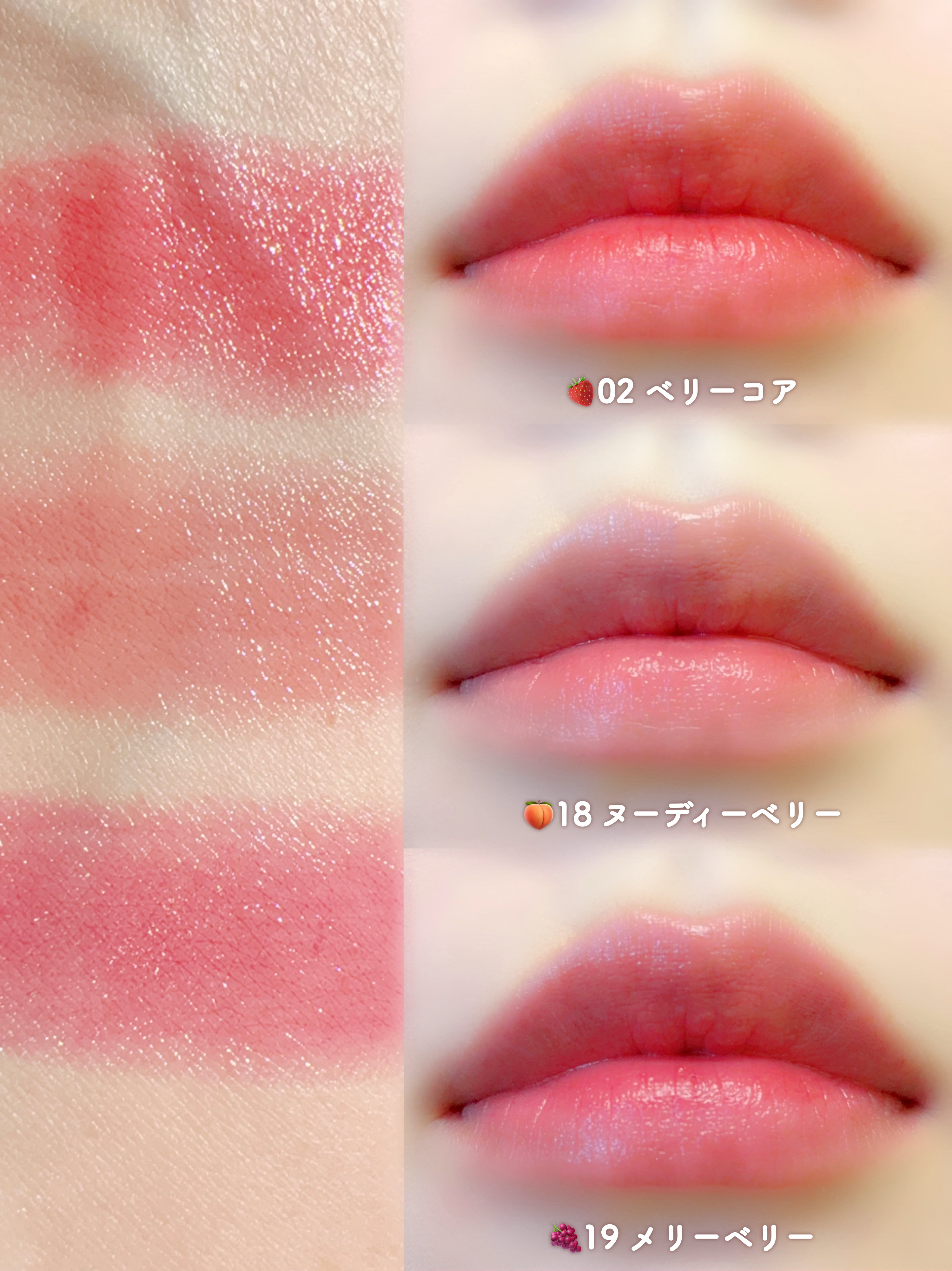 - <01 ヴィヴィディ(Vividy)【EC展開カラー】> ペンタイソステアリン酸ジペンタエリスリチル、トリ(カプリル酸/カプリン酸)グリセリル、ラウロイルグルタミン酸ジ(フィトステリル/オクチルドデシル)、オクチルドデカノール、グリセリルウンデシルジメチコン、ジフェニルジメチコン、合成ワックス、ダイマージリノール酸(フィトステリル/イソステアリル/セチル/ステアリル/ベヘニル)、トリイソステアリン酸ポリグリセリル-2、(アクリレーツ/アクリル酸ステアリル/メタクリル酸ジメチコン)コポリマー、ラウリルポリグリセリル-3ポリジメチルシロキシエチルジメチコン、(エチレン/プロピレン)コポリマー、ジメチコン、ポリヒドロキシステアリン酸、香料、レシチン、パルミチン酸エチルヘキシル、イソステアリン酸、ミリスチン酸イソプロピル、ポリリシノレイン酸ポリグリセリル-3、水酸化Al、トリエトキシカプリリルシラン、トコフェロール、赤226、黄5、赤104(1)、酸化チタン、赤201 <02 ベリーコア(Berry Core)> ペンタイソステアリン酸ジペンタエリスリチル、トリ(カプリル酸/カプリン酸)グリセリル、オクチルドデカノール、ラウロイルグルタミン酸ジ(フィトステリル/オクチルドデシル)、グリセリルウンデシルジメチコン、ジフェニルジメチコン、合成ワックス、ダイマージリノール酸(フィトステリル/イソステアリル/セチル/ステアリル/ベヘニル)、トリイソステアリン酸ポリグリセリル-2、(アクリレーツ/アクリル酸ステアリル/メタクリル酸ジメチコン)コポリマー、ラウリルポリグリセリル-3ポリジメチルシロキシエチルジメチコン、(エチレン/プロピレン)コポリマー、ジメチコン、香料、トコフェロール、赤202、赤201、黄5、酸化鉄 <03 クランベリー(Cranberry)【EC展開カラー】> ペンタイソステアリン酸ジペンタエリスリチル、オクチルドデカノール、トリ(カプリル酸/カプリン酸)グリセリル、ラウロイルグルタミン酸ジ(フィトステリル/オクチルドデシル)、グリセリルウンデシルジメチコン、ジフェニルジメチコン、合成ワックス、ダイマージリノール酸(フィトステリル/イソステアリル/セチル/ステアリル/ベヘニル)、トリイソステアリン酸ポリグリセリル-2、(アクリレーツ/アクリル酸ステアリル/メタクリル酸ジメチコン)コポリマー、ラウリルポリグリセリル-3ポリジメチルシロキシエチルジメチコン、(エチレン/プロピレン)コポリマー、ジメチコン、香料、リンゴ酸ジイソステアリル、トコフェロール、ポリヒドロキシステアリン酸、レシチン、トリエトキシカプリリルシラン、パルミチン酸エチルヘキシル、イソステアリン酸、ミリスチン酸イソプロピル、ポリリシノレイン酸ポリグリセリル-3、酸化鉄、黄5、赤202、赤230(1) <04 ヘイベスティ(Hey Bestie)【EC展開カラー】> ペンタイソステアリン酸ジペンタエリスリチル、トリ(カプリル酸/カプリン酸)グリセリル、ラウロイルグルタミン酸ジ(フィトステリル/オクチルドデシル)、オクチルドデカノール、ジフェニルジメチコン、グリセリルウンデシルジメチコン、合成ワックス、ダイマージリノール酸(フィトステリル/イソステアリル/セチル/ステアリル/ベヘニル)、トリイソステアリン酸ポリグリセリル-2、ラウリルポリグリセリル-3ポリジメチルシロキシエチルジメチコン、(アクリレーツ/アクリル酸ステアリル/メタクリル酸ジメチコン)コポリマー、ポリヒドロキシステアリン酸、(エチレン/プロピレン)コポリマー、ジメチコン、レシチン、香料、パルミチン酸エチルヘキシル、イソステアリン酸、ミリスチン酸イソプロピル、ポリリシノレイン酸ポリグリセリル-3、水酸化Al、トリエトキシカプリリルシラン、トコフェロール、酸化チタン、赤202、黄5、赤104(1)、酸化鉄、青1 <05 ブルーベリー(Blueberry)> ペンタイソステアリン酸ジペンタエリスリチル、トリ(カプリル酸/カプリン酸)グリセリル、ラウロイルグルタミン酸ジ(フィトステリル/オクチルドデシル)、オクチルドデカノール、グリセリルウンデシルジメチコン、ジフェニルジメチコン、合成ワックス、ダイマージリノール酸(フィトステリル/イソステアリル/セチル/ステアリル/ベヘニル)、トリイソステアリン酸ポリグリセリル-2、ラウリルポリグリセリル-3ポリジメチルシロキシエチルジメチコン、(アクリレーツ/アクリル酸ステアリル/メタクリル酸ジメチコン)コポリマー、(エチレン/プロピレン)コポリマー、ジメチコン、香料、水酸化Al、トリエトキシカプリリルシラン、トコフェロール、酸化チタン、酸化鉄、赤202、青1、赤104(1) <06 ニューローズ(New Rose)> ペンタイソステアリン酸ジペンタエリスリチル、トリ(カプリル酸/カプリン酸)グリセリル、ラウロイルグルタミン酸ジ(フィトステリル/オクチルドデシル)、オクチルドデカノール、ジフェニルジメチコン、グリセリルウンデシルジメチコン、合成ワックス、ダイマージリノール酸(フィトステリル/イソステアリル/セチル/ステアリル/ベヘニル)、トリイソステアリン酸ポリグリ