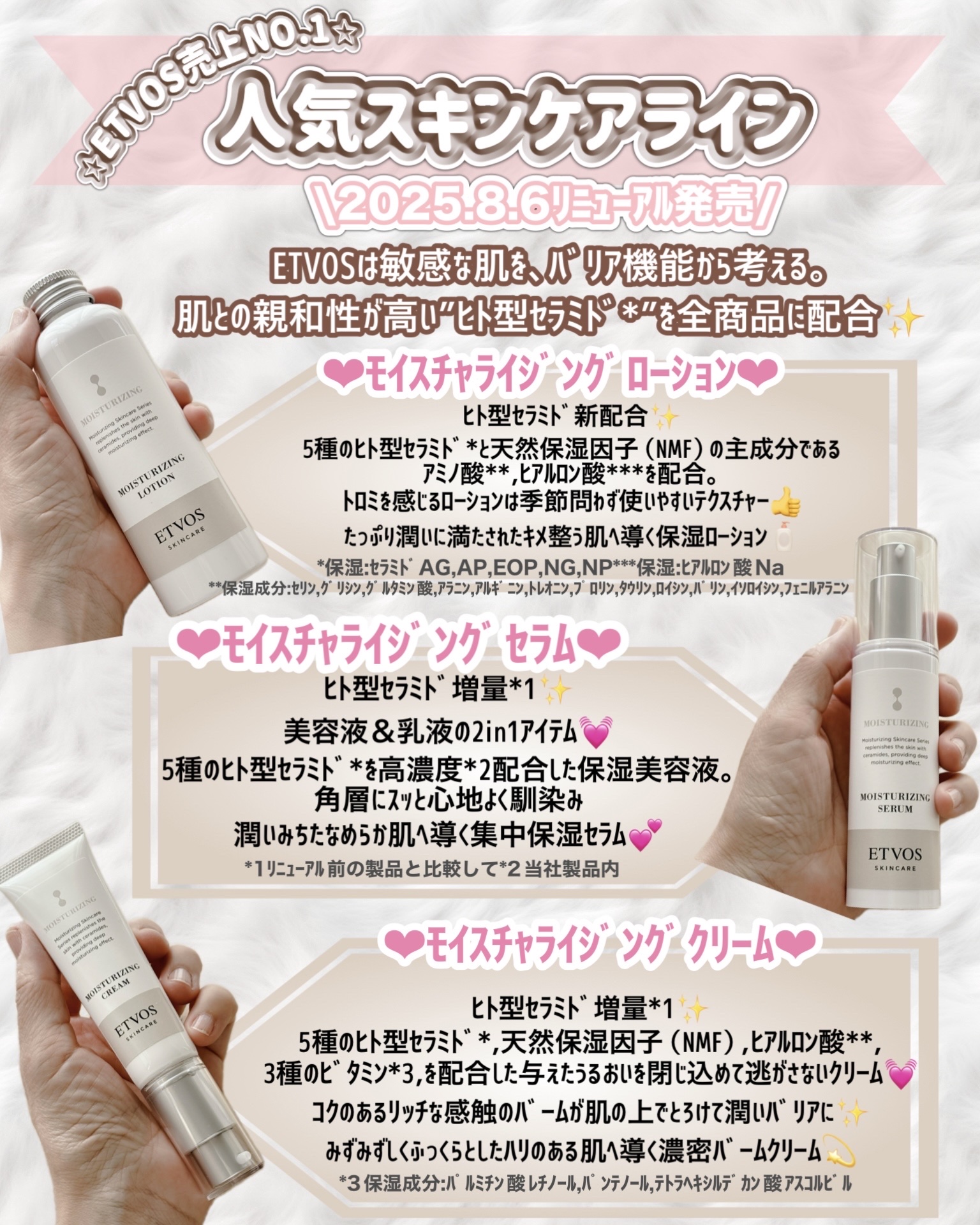 日に日に深まる乾燥🍂今年リニューアルしたETVOSのモイスチャーラインと新たに発売したブランド初の美容液、アルティモイストコアコンセントレート全てのアイテムにヒト型セラミドが入っていて、既存品からは増量が🫧余計なものは入っていなくて、シンプル...