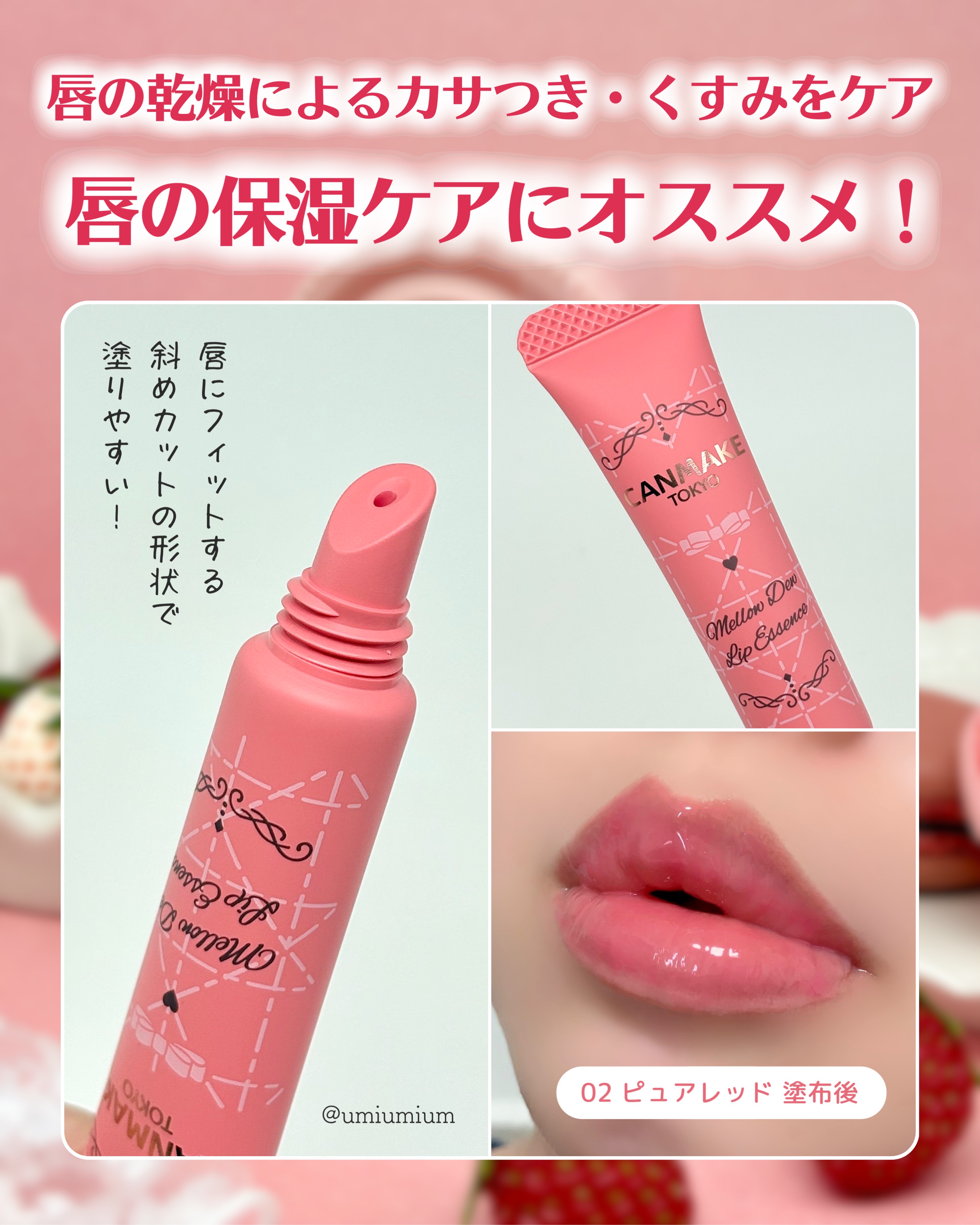 - 2025年7月以降順次定番化! いつでも保湿ケア♡ぷるぷる唇 リップ美容液! メロウデューリップマスクから登場した、いつでも保湿ケアができるチューブタイプのリップ美容液です。 乾燥によるカサつきくすみが気になる唇に!美容液成分96%配合。 【しっとりぷるぷる♪集中保湿ケア】 ・長時間しっとりキープし、うるおい持続。 ・水分蒸散を防ぎ、乾燥から守る。 【べたつきにくい】 【唇の縦ジワ補正※】 ・唇の縦ジワを補正し、ふっくらとハリのある唇に。 ※メイクアップ効果 【ぷっくりグロス効果&ナイトケア】 ツヤ感をプラスして、リップグロスとして使える♪ たっぷり塗ればナイトケアにも! 【唇の荒れを防ぐ】 ★美容保湿成分配合★ グリチルレチン酸ステアリル、セラミドNP、トコフェロール、ピリドキシンHCl、パンテノール 【細めの斜めカットチューブ】 唇にフィットし、はみ出さずに塗りやすい。持ち運びしやすく、日中のお出かけにも♡