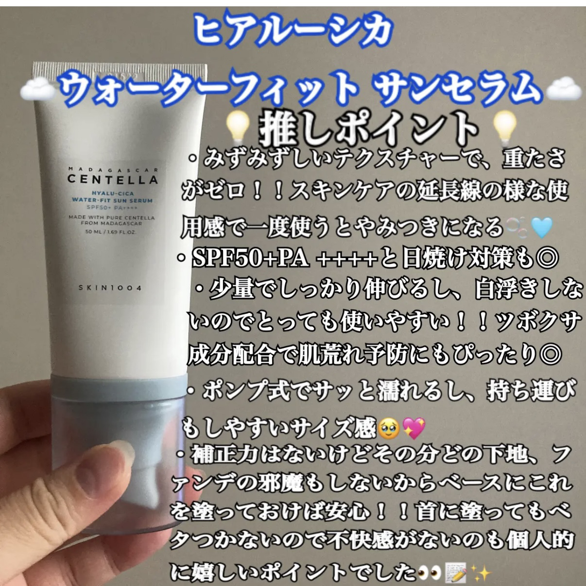SKIN1004ヒアルーシカウォーターフィットサンセラムやさしい使い心地の日焼け止め☀️ベタつきがほとんどない保湿日焼け止め!乾燥して敏感になった肌に水分たっぷりチャージ😊つけると水分感のあるクリームで肌がしっとりする感じです!✨伸びがよく使...