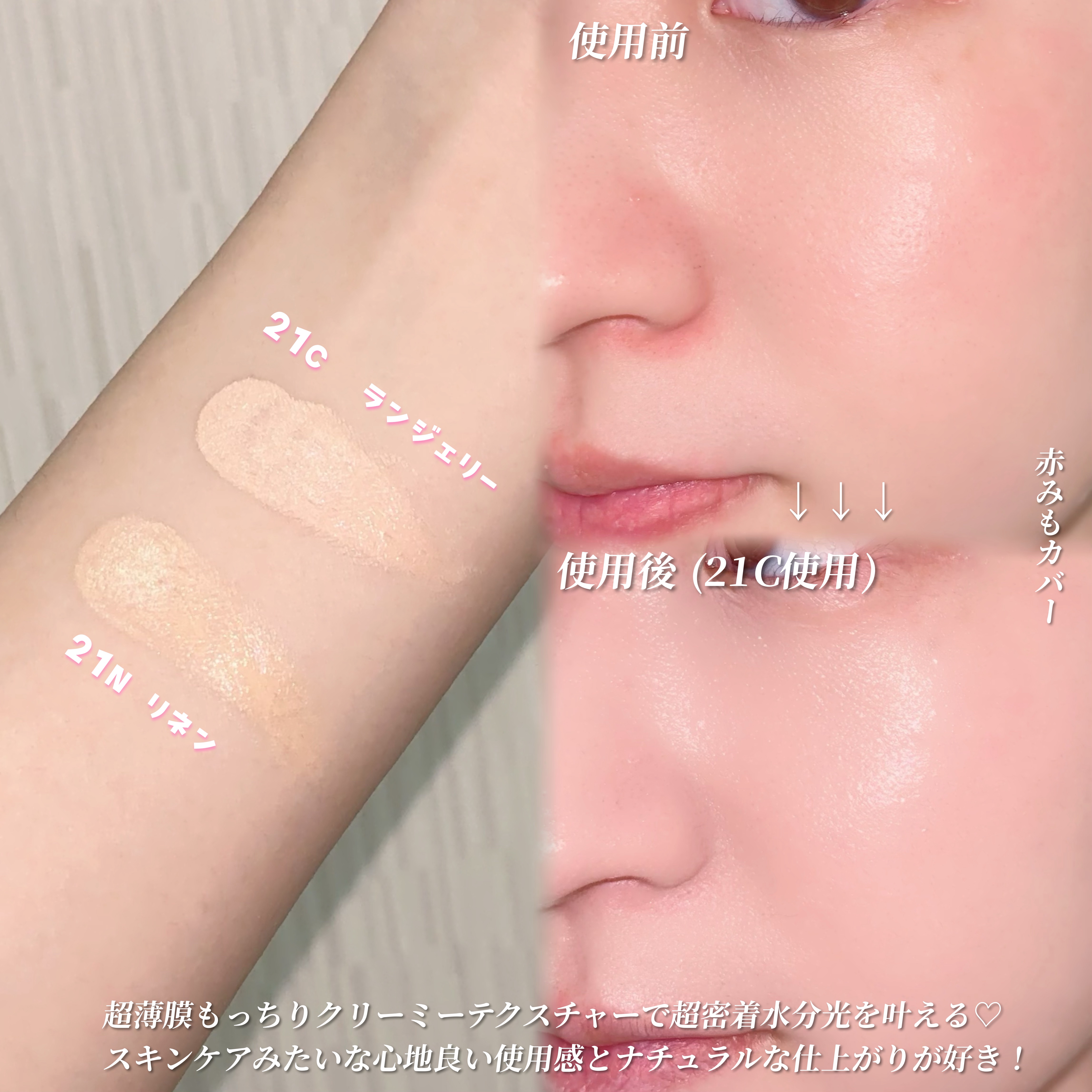 - <19C ライト(LIGHT)> 水、酸化チタン、ジフェニルシロキシフェニルトリメチコン、ホモサレート、サリチル酸エチルヘキシル、フェニルトリメチコン、トリメチルシロキシケイ酸、BG、ジ安息香酸PG、グリセリン、ラウリルPEG-10トリス(トリメチルシロキシ)シリルエチルジメチコン、(アクリレーツ/ジメチコン)コポリマー、ナイアシンアミド、セチルPEG/PPG-10/1ジメチコン、シクロペンタシロキサン、ポリメチルシルセスキオキサン、カミツレ水、ダマスクバラ花水、ジステアルジモニウムヘクトライト、シクロヘキサシロキサン、硫酸Mg、セスキオレイン酸ソルビタン、ジメチコン、1,2-ヘキサンジオール、トリベヘニン、(ベヘン酸/エイコサン二酸)グリセリル、トリエトキシカプリリルシラン、水酸化Al、(ジメチコン/ビニルジメチコン)クロスポリマー、カプリリルグリコール、香料、ジメチルシリル化シリカ、エチルヘキシルグリセリン、アデノシン、ヒアルロン酸Na、パンテノール、カエサルピニアスピノサ果実エキス、トコフェロール、カッパフィカスアルバレジエキス、テトラ(ジ-t-ブチルヒドロキシヒドロケイヒ酸)ペンタエリスリチル、ヒアルロン酸ヒドロキシプロピルトリモニウム、アセチルヒアルロン酸Na、加水分解ヒアルロン酸、ヒアルロン酸、ヒアルロン酸クロスポリマーNa、加水分解ヒアルロン酸Na、ヒアルロン酸K、酸化鉄 <21C ランジェリー(LINGERIE)> 水、酸化チタン、ジフェニルシロキシフェニルトリメチコン、ホモサレート、サリチル酸エチルヘキシル、フェニルトリメチコン、トリメチルシロキシケイ酸、BG、ジ安息香酸PG、グリセリン、ラウリルPEG-10トリス(トリメチルシロキシ)シリルエチルジメチコン、(アクリレーツ/ジメチコン)コポリマー、ナイアシンアミド、セチルPEG/PPG-10/1ジメチコン、シクロペンタシロキサン、ポリメチルシルセスキオキサン、ダマスクバラ花水、カミツレ水、ジステアルジモニウムヘクトライト、シクロヘキサシロキサン、硫酸Mg、セスキオレイン酸ソルビタン、ジメチコン、1,2-ヘキサンジオール、トリベヘニン、(ベヘン酸/エイコサン二酸)グリセリル、トリエトキシカプリリルシラン、水酸化Al、(ジメチコン/ビニルジメチコン)クロスポリマー、カプリリルグリコール、香料、ジメチルシリル化シリカ、エチルヘキシルグリセリン、アデノシン、ヒアルロン酸Na、パンテノール、カエサルピニアスピノサ果実エキス、トコフェロール、カッパフィカスアルバレジエキス、テトラ(ジ-t-ブチルヒドロキシヒドロケイヒ酸)ペンタエリスリチル、ヒアルロン酸ヒドロキシプロピルトリモニウム、アセチルヒアルロン酸Na、加水分解ヒアルロン酸、ヒアルロン酸、ヒアルロン酸クロスポリマーNa、加水分解ヒアルロン酸Na、ヒアルロン酸K、酸化鉄 <21N リネン(LINEN)> 水、酸化チタン、ジフェニルシロキシフェニルトリメチコン、ホモサレート、サリチル酸エチルヘキシル、フェニルトリメチコン、トリメチルシロキシケイ酸、BG、グリセリン、ジ安息香酸PG、ラウリルPEG-10トリス(トリメチルシロキシ)シリルエチルジメチコン、(アクリレーツ/ジメチコン)コポリマー、ナイアシンアミド、セチルPEG/PPG-10/1ジメチコン、シクロペンタシロキサン、ダマスクバラ花水、カミツレ水、ジステアルジモニウムヘクトライト、ポリメチルシルセスキオキサン、シクロヘキサシロキサン、硫酸Mg、セスキオレイン酸ソルビタン、ジメチコン、1,2-ヘキサンジオール、トリベヘニン、(ベヘン酸/エイコサン二酸)グリセリル、トリエトキシカプリリルシラン、水酸化Al、(ジメチコン/ビニルジメチコン)クロスポリマー、カプリリルグリコール、香料、ジメチルシリル化シリカ、エチルヘキシルグリセリン、アデノシン、ヒアルロン酸Na、パンテノール、カエサルピニアスピノサ果実エキス、トコフェロール、カッパフィカスアルバレジエキス、テトラ(ジ-t-ブチルヒドロキシヒドロケイヒ酸)ペンタエリスリチル、ヒアルロン酸ヒドロキシプロピルトリモニウム、ヒアルロン酸クロスポリマーNa、アセチルヒアルロン酸Na、ヒアルロン酸K、加水分解ヒアルロン酸Na、加水分解ヒアルロン酸、ヒアルロン酸、酸化鉄 <23N ジンジャー(GINGER)> 水、酸化チタン、ジフェニルシロキシフェニルトリメチコン、ホモサレート、サリチル酸エチルヘキシル、フェニルトリメチコン、トリメチルシロキシケイ酸、BG、ジ安息香酸PG、グリセリン、ラウリルPEG-10トリス(トリメチルシロキシ)シリルエチルジメチコン、(アクリレーツ/ジメチコン)コポリマー、ナイアシンアミド、セチルPEG/PPG-10/1ジメチコン、シクロペンタシロキサン、ダマスクバラ花水、カミツレ水、ジステアルジモニウムヘクトライト、シクロヘキサシロキサン、硫酸Mg、セスキオレイン酸ソルビタン、ジメチコン、1,2-ヘキサンジオール、トリベヘニン、(ベヘン酸/エイコサン二酸)グリセリル、ポリメチルシルセスキオキサン、トリエトキシカプリリルシラン、水酸化Al、(ジメチコン/ビニルジ
