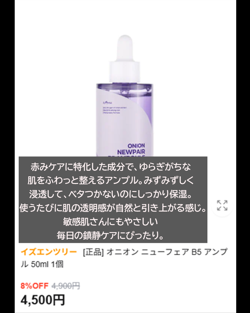 | 少しとろんとしたみずみずしいテクスチャーで伸び・肌なじみがよくベタつきのないしっとりとしたつけ心地だと思いました | 詳細を見る | ||