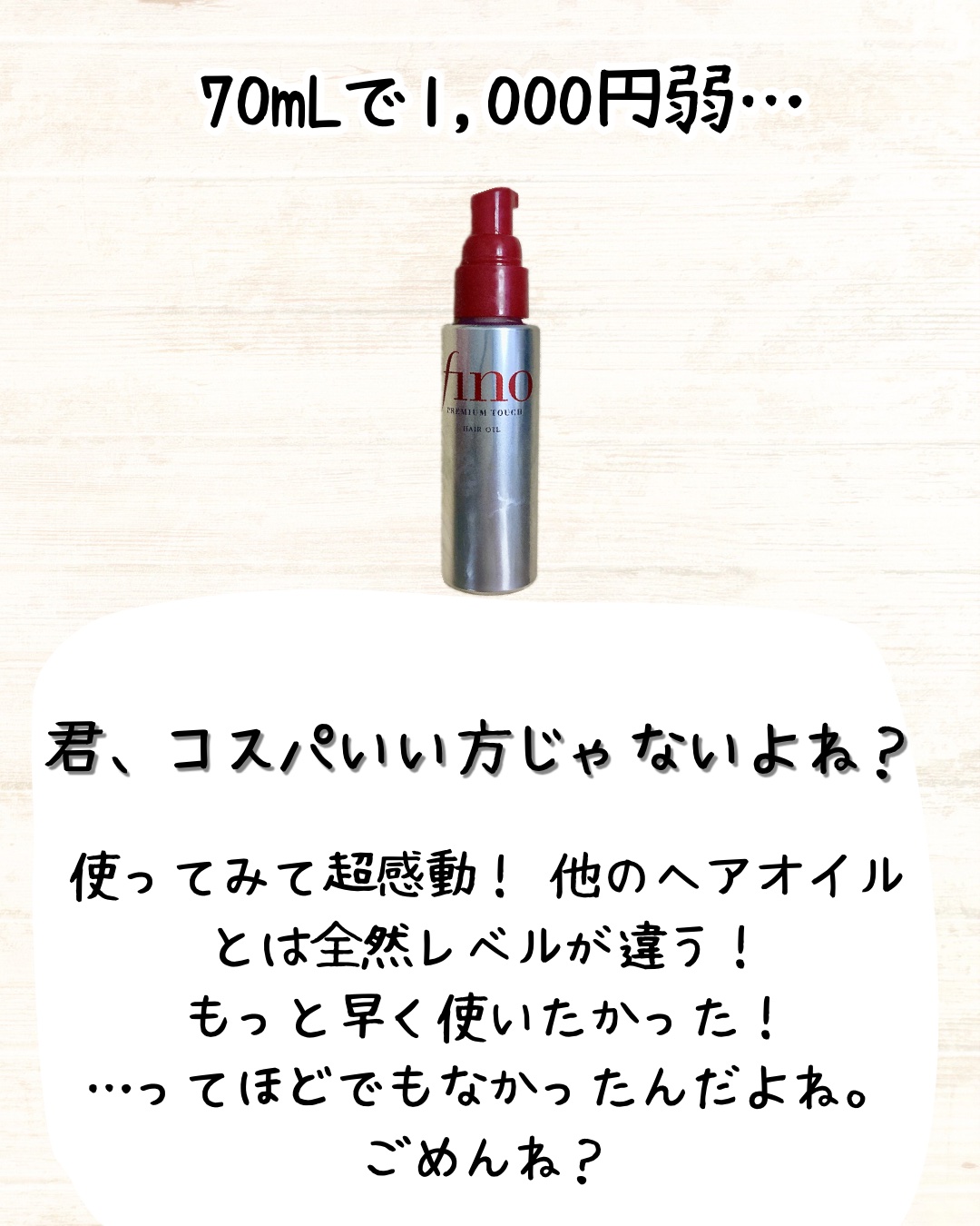 リピート使い切り!フィーノヘアオイル70ml・普段からヘアアイロンを使いこなしたようなヘアアレンジをしている方・髪の傷みが気になる方・多少値段がはってもいいよって方には、すごくおすすめ。効果は確かにある。うん。私がスーパーロングすぎたんだな。...