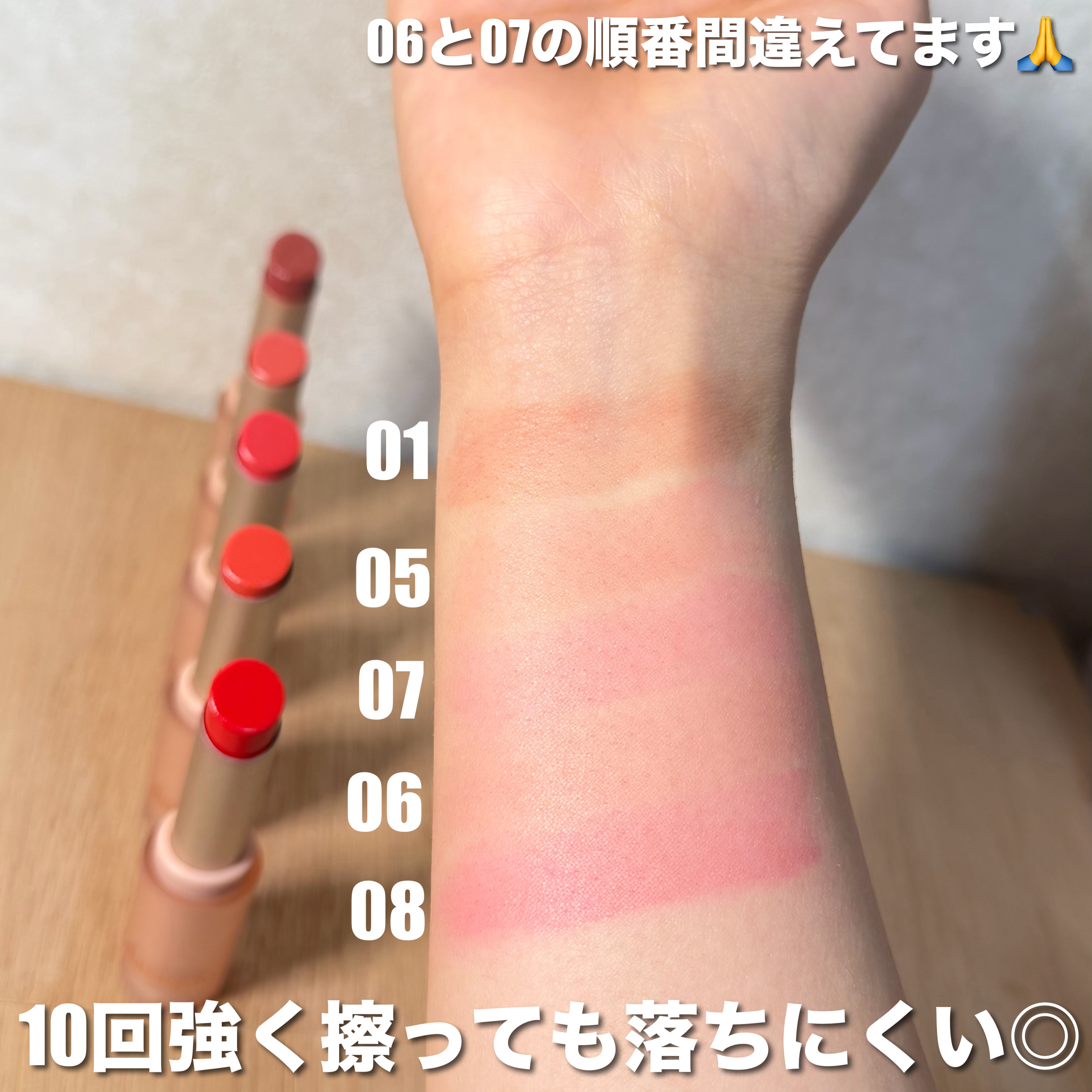 お気に入りは02ピンクバナナと03陽炎 02 Pink banana 💗 ベージュベースのピンクレッド 03陽炎 🧡 ベージュベースのオレンジ 04パンプキンワイン🧡 オレンジベースのブラウン 05ダークフィグ🤎 赤みかかったブラウン 062:00AM ❤️ 白雪姫のりんごみたいなパープルベースレッド 07ラスボス❤️ 明るめのしっかりとしたレッド