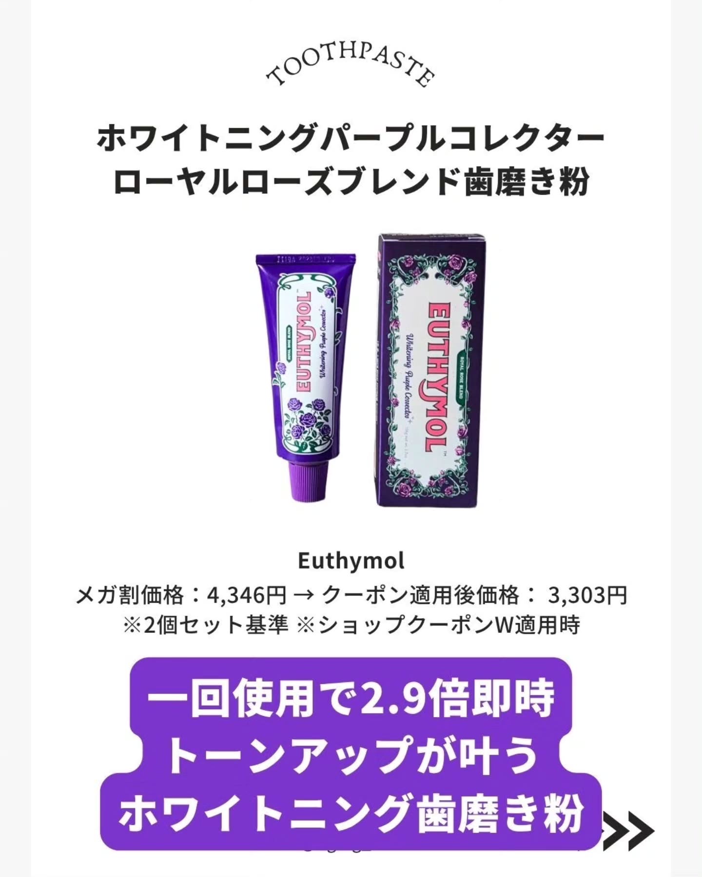 .♡@euthymol.japan@charde_jp@skinfood_japanQoo10メガ割で狙ってるアイテム4選!🎀🤍♡Euthymolホワイトニングパープルコレクターローヤルローズブレンド歯磨き粉一回使用で2.9倍即時トーンアップ...