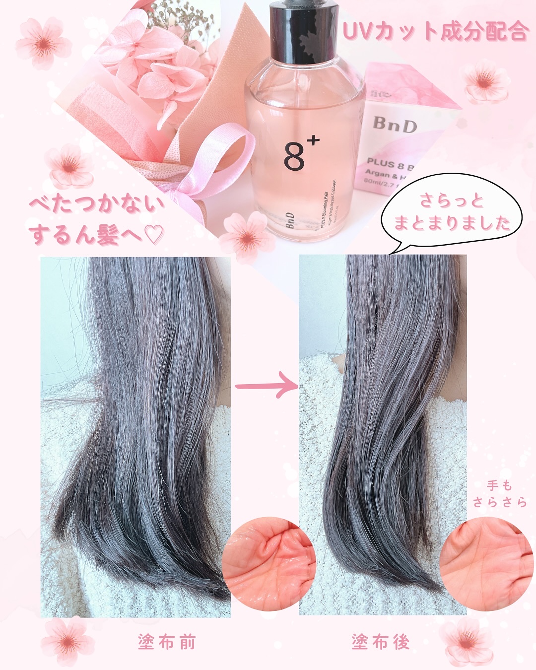 【BnDSAKURA+8ブルーミングヘアオイル】BnDSAKURA+8ブルーミングヘアオイル使ってみました。♪:*:♪・∴・∴・∴・∴・∴‥∴‥∵‥∴‥‥∵∴・∴・∴・∴・♪:*:♪忙しい朝にケアを叶えるヘアオイル髪に素早く浸透し、8秒でパサ...