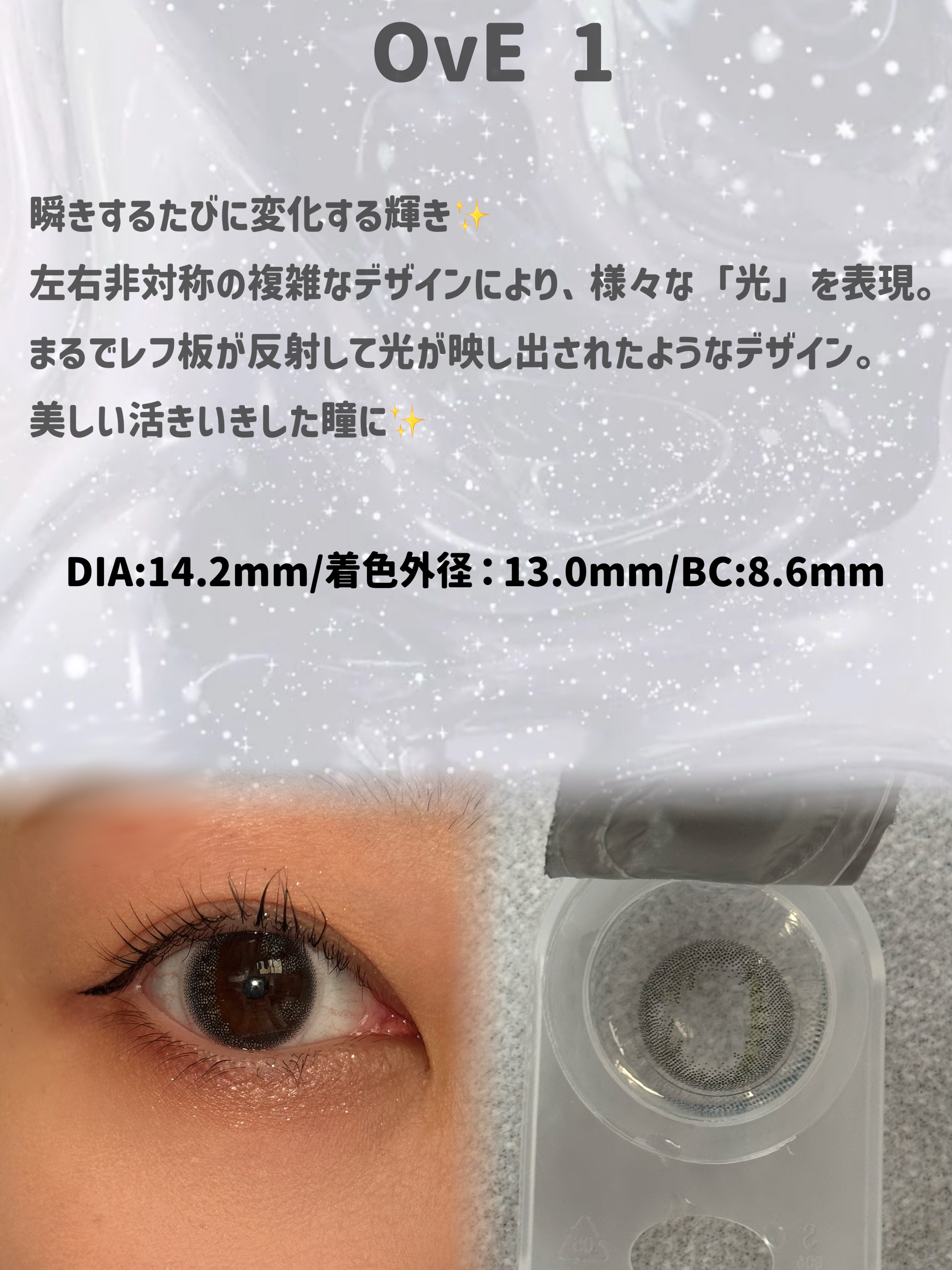- 「左右⾮対称なデザイン」で「本来の⾃分の瞳の輝きを⽣かす」「⾊」ではなく、瞳に⼊る「光」を再現した今までとは異なる発想のこだわりデザインレンズ ⿊⽬を⼤きく、瞳を⾊付けることを⽬的とした従来のカラーコンタクトレンズとは異なる発想で、瞳の中でキラキラと輝く光を表現し、透明感と潤いに溢れた瞳を実現。 繊細な⾊合いとそれを左右⾮対称に配したデザインによって、柔らかく朗らかな印象を⾃然に演出します。 発光するような瞳は、視線を集めるので⼩顔感も期待できます。 着色直径 6:12.1mm、1~4,6,7:13.0mm、5,8:14.0mm 直径(DIA) 6:14.0mm、1~4,6,7:14.2mm、5,8:14.5mm ベースカーブ 1~5,7,8:8.6mm、6:8.7mm 度数 0.00、-0.50D〜-10.00D 含⽔率 38%