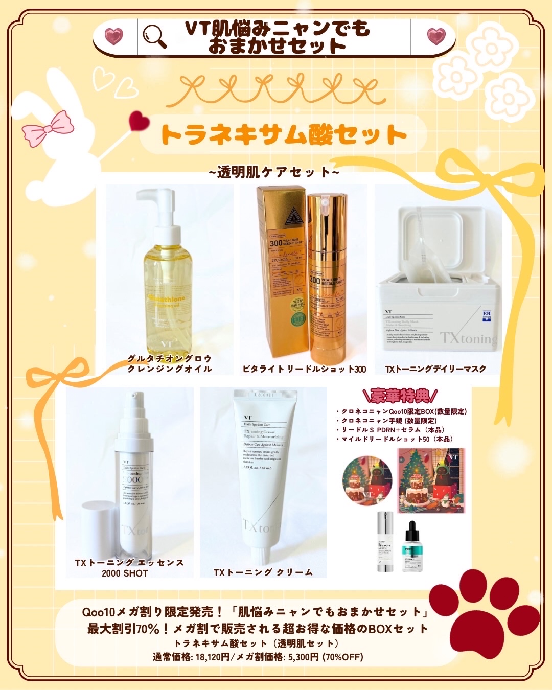 🎄今年のメガ割、ぜったい見逃さないで…!🐈⬛✨VTから「肌悩ニャンでもおまかせセット」が登場して、もう破格すぎてびっくりしてる……😳💛特におすすめなのは透明感ケアをまとめてできちゃうトラネキサム酸セット!通常18,120円が、メガ割だと...