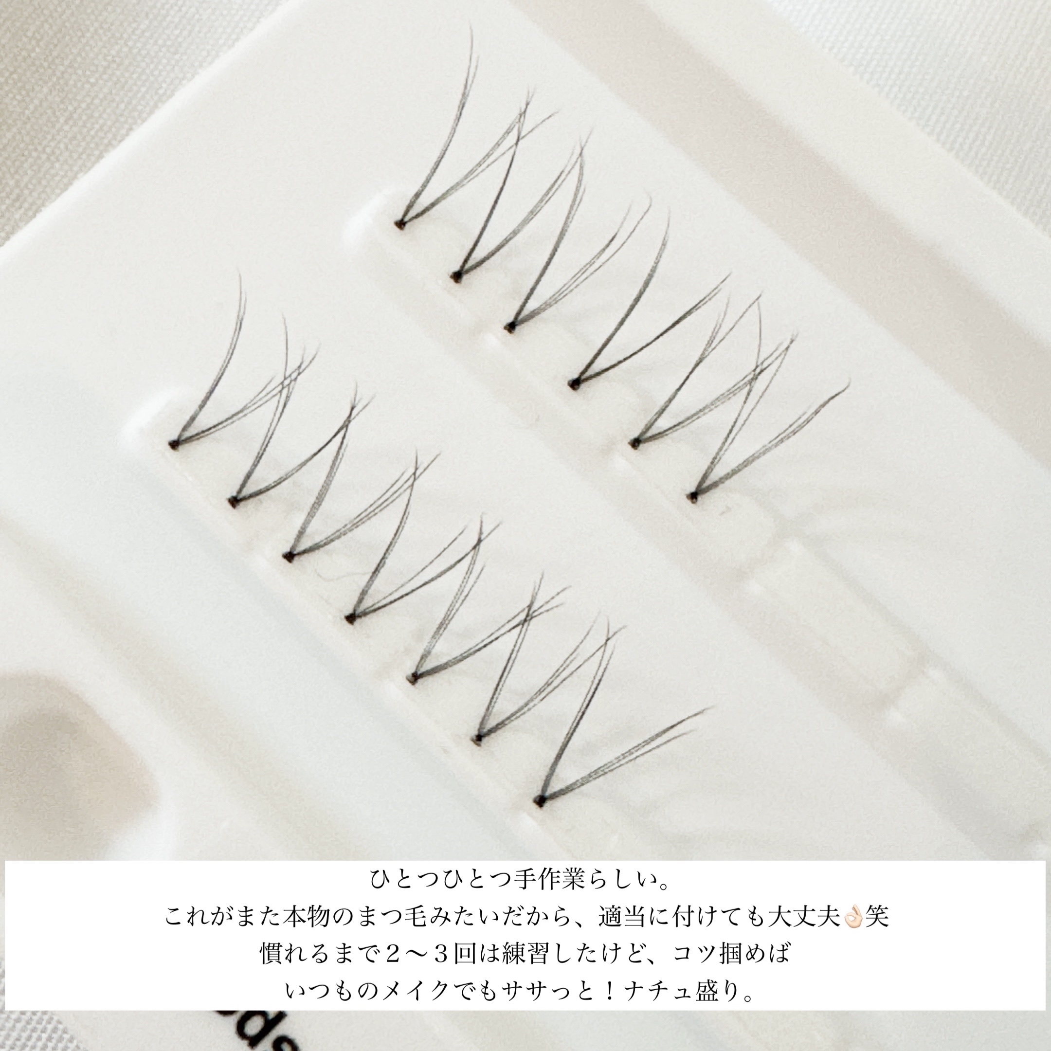韓国のメイクサロンでも愛用されている、韓国アイドルのようなまつげになれる部分用つけまつげです🎀 とっても綺麗で繊細な束感まつげが簡単に作れるので、マスカラとピンセットを使って束感まつ毛を作るより簡単でした❕ アイドル級のまつ毛を作りたい方にとってもおすすめです💖