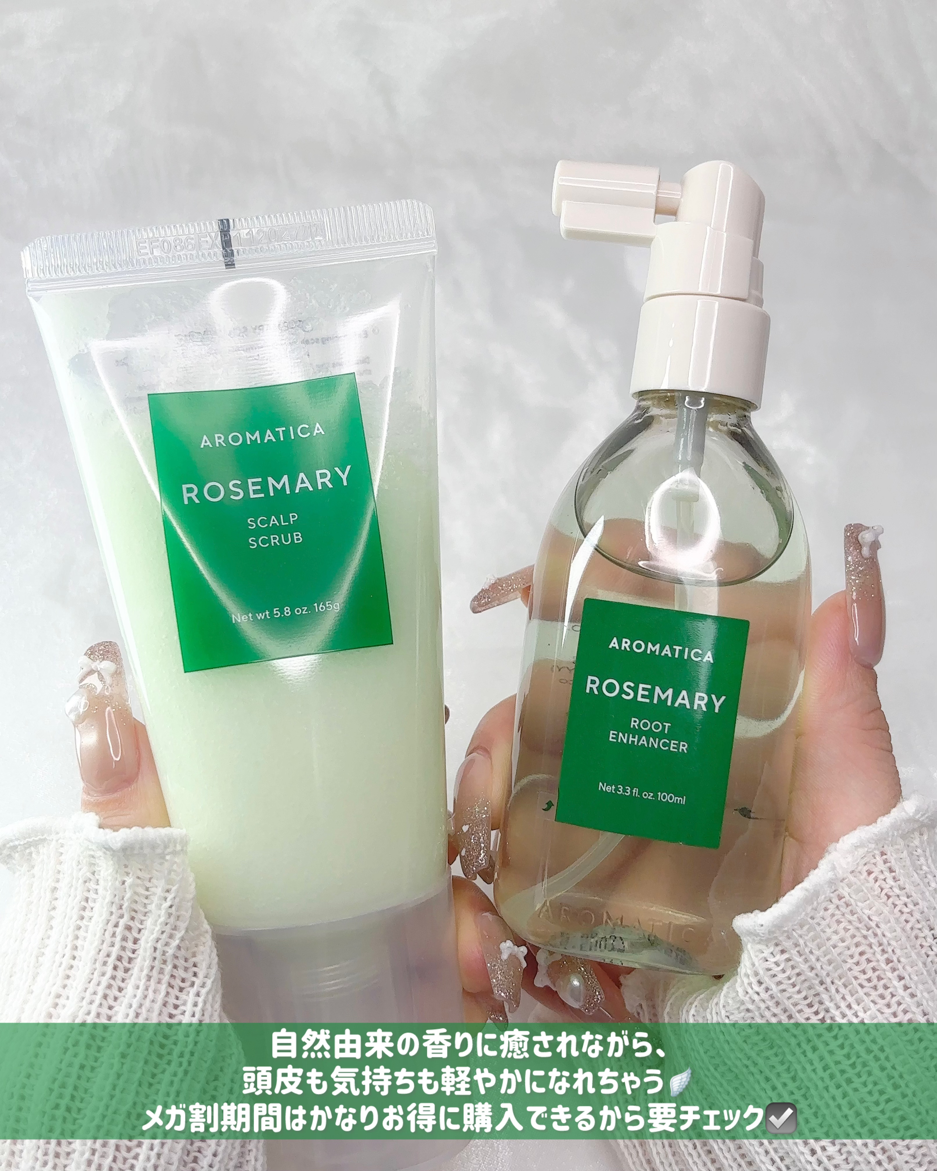 AROMATICAローズマリールートエンハンサー&ローズマリースカルプスクラブ💚アロマティカのアイテムで頭皮ケアも抜かりなく♡ローズマリールートエンハンサーは毛根に栄養、頭皮にハリを与える!しゅしゅっとスプレータイプなので使いやすくリフレッシ...