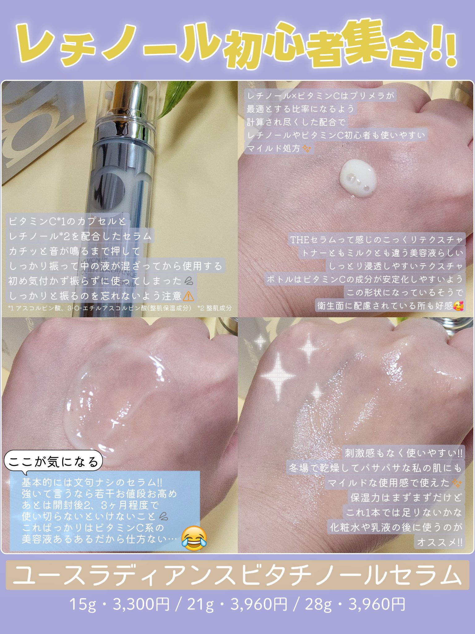 💎ユースラディアンスビタチノールセラム💎ビタチノールセラムメガショット ゲルマスク💎レチノールボリュームリップセラムプリメラ様よりご提供頂きました✨💎ユースラディアンスビタチノールセラム 「レチノール※1」と「ビタミンC※2」 どっちも使い...