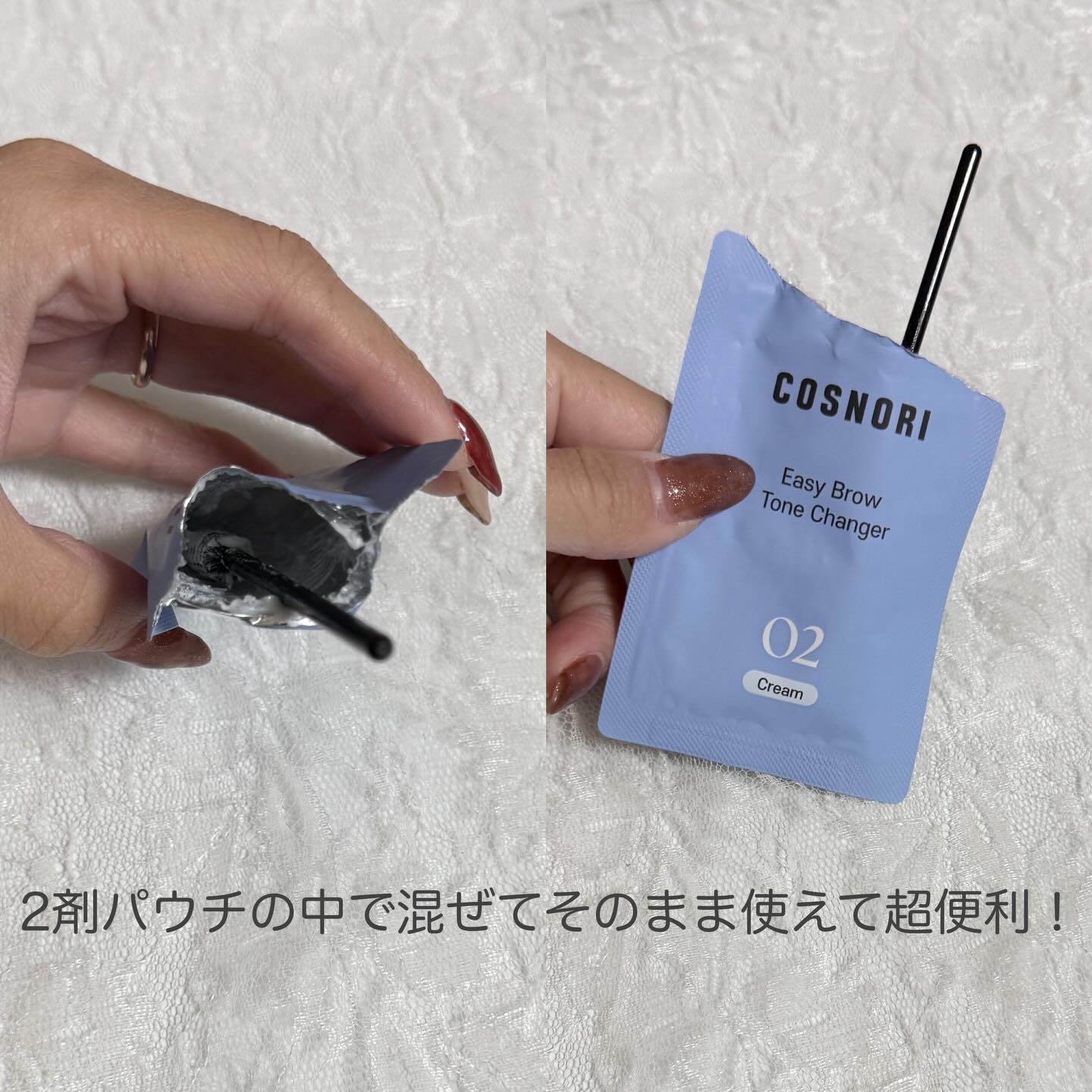\セルフで簡単!垢抜け眉/COSNORIイージーブロウトーンチェンジャー(眉毛ブリーチ剤)使い方は1剤の袋の中に2剤のパウダーを入れて付属のブラシで混ぜて眉毛に塗ります💡2~5分の時間調整で失敗なしで好みの明るさまで脱色できるよ!ちなみに私は...