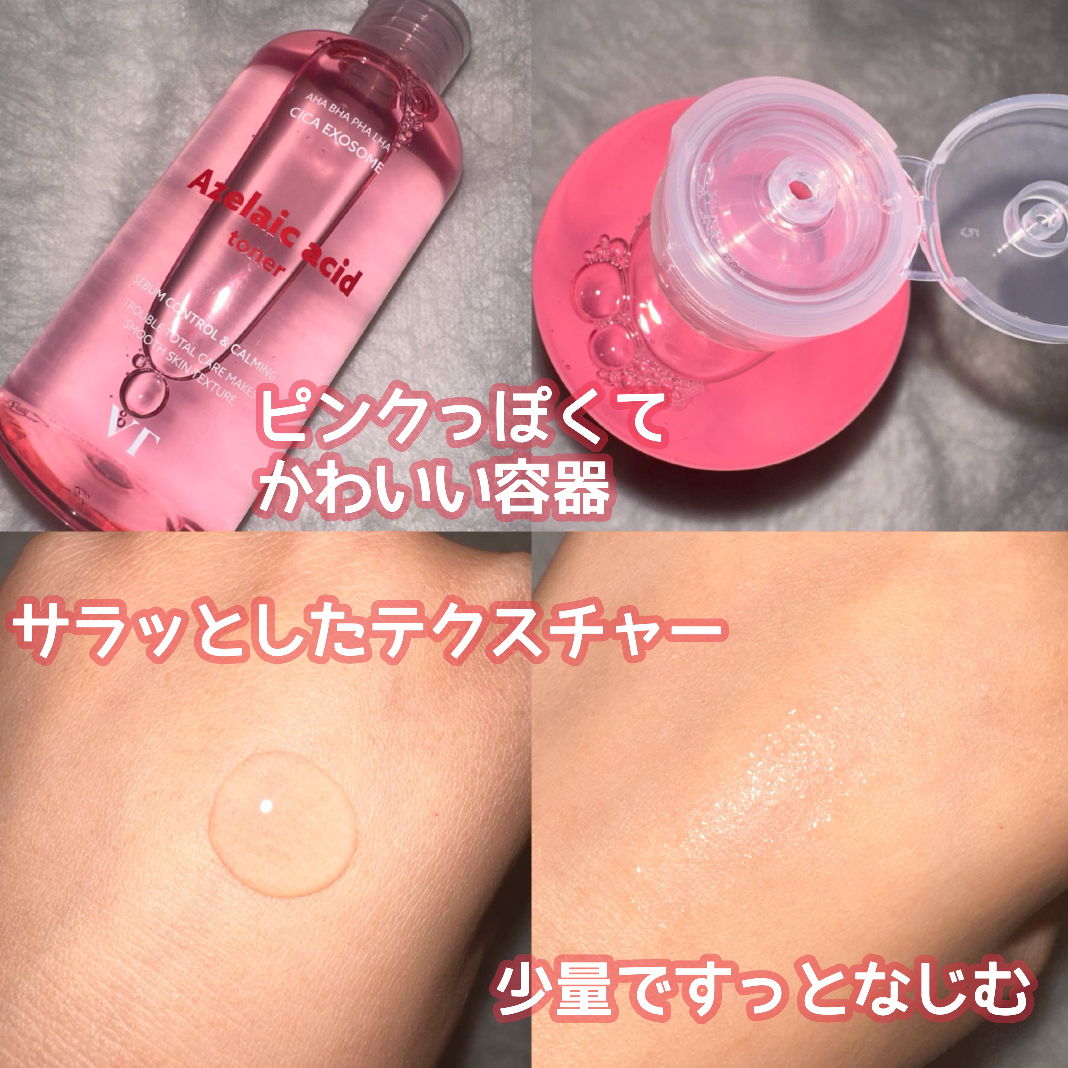 - VTの話題のアゼライン酸シリーズからついにトナーまで登場。 VTのアゼライン酸トナーはゆらぎやすい肌への“使いやすさ”を重視。 皮脂ケア成分に加え、整肌成分のティーツリー・ツボクサエキスをプラス。 スプレー容器に入れ替えてパシャパシャ使用して見てください。 <過度な皮脂悩みにアプローチする美容成分(整肌)> ✔高純度99%アゼライン酸:肌荒れを防いで健やかに保つ ✔AHA: 角質ケア&乾燥くすみにアプローチ ✔ティーツリー:ゆらぎやすい肌を整える ■使い方 洗顔後、コットンや手に適量を出し、顔の内側から外側へ肌のキメに沿って均一に塗り広げてなじませます。 ■このような方へおすすめ 皮脂や角質によるブラックヘッドや毛穴のケアを行いたい方 肌のキメを整えたい方 肌荒れを防ぎたい方 VTアゼライン酸ライン使いしたい方