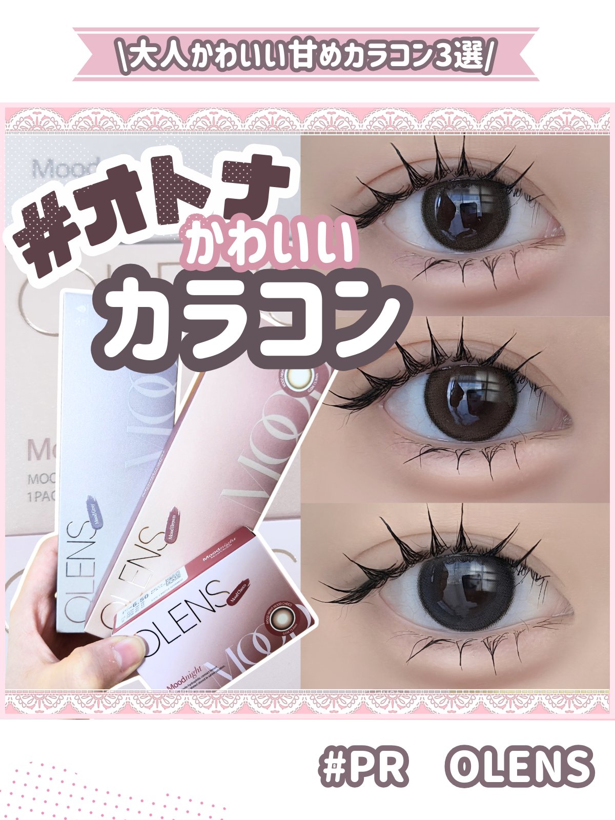 OLENSの大人可愛いアッシュ系カラコン3選【MoodBrown/MoodGray】・使用期限:1日・DIA:14.2mm・着色直径:13.3mm・含水率:48%【MoodChoco】・使用期限:1ヶ月・DIA:14.0mm・着色直径:13....