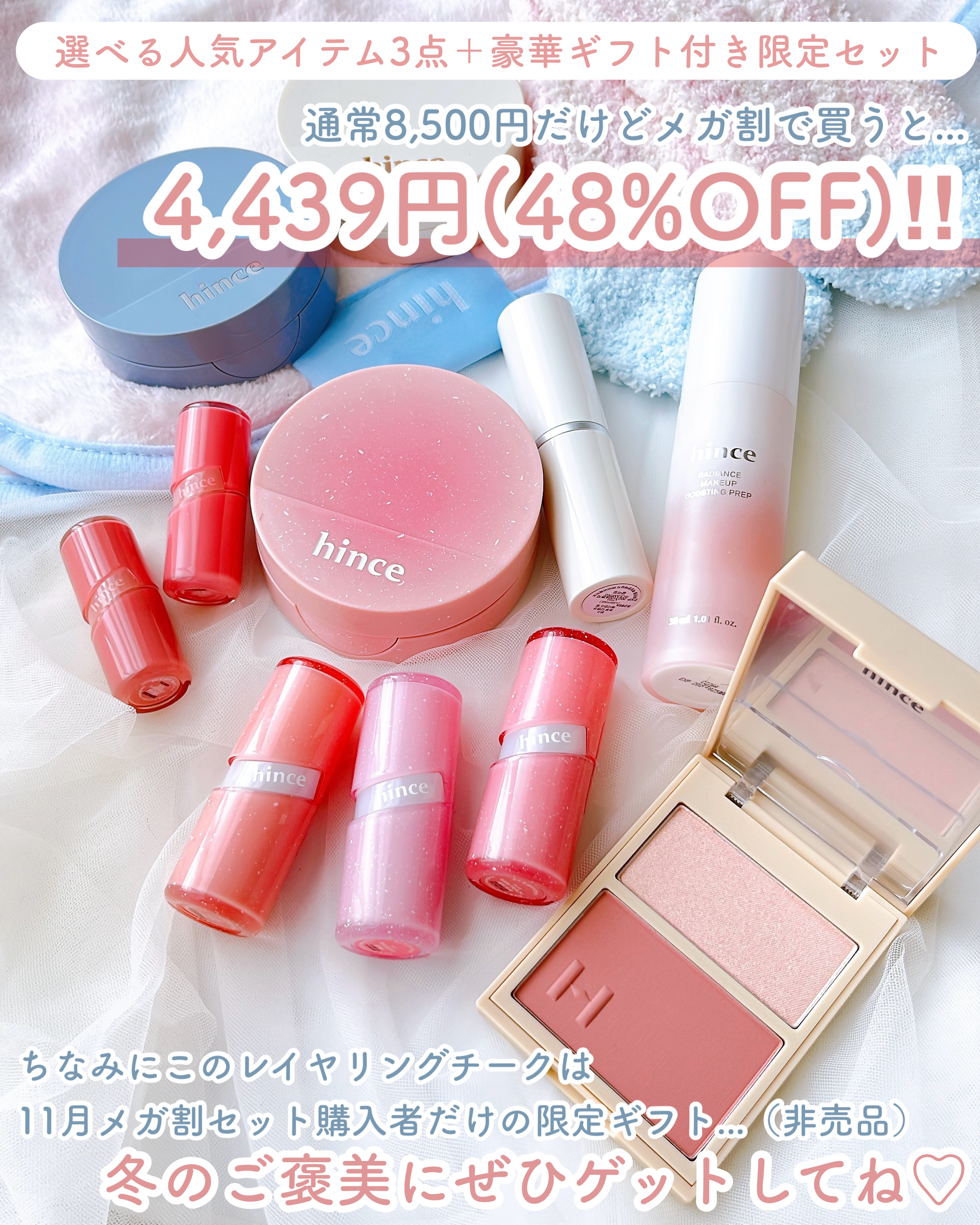 ↻››年間100万円美容に費やすコスメの変態OL【48%オフ】hinceの人気アイテムが揃う!お得すぎるセット販売hinceからメガ割だけのお得な限定セットが登場!なんとこちら48%オフなんです✨しかも嬉しいのが、ファンデやリップの色...