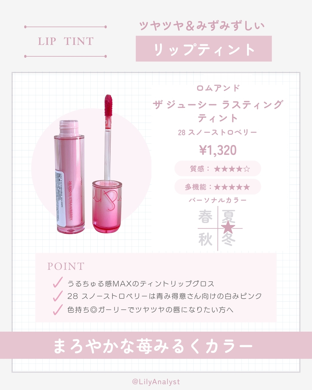 ロムアンドの定番人気リップ、ザジューシーラスティングティントからブルベ夏カラーをピックアップ🪻ちなみに6/2までAmazonスマイルセール、5/31からメガ割なのでご検討中の方はこの機会にぜひ✨03ベアグレープ▶︎穏やかなピンクベージュリニュ...