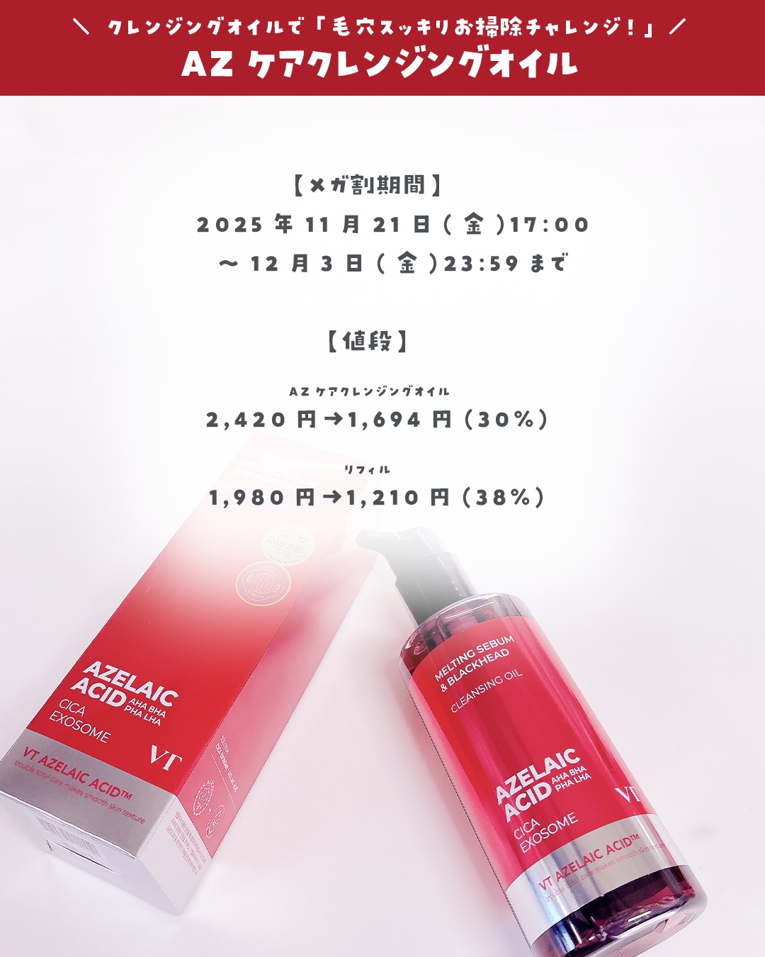 - 最近話題の毛穴ケア・整肌成分アゼライン酸!VTからはクレンジングオイルが登場! ポイントメイクまで落とすしっかりした洗浄力で、毛穴・皮脂までケアし保湿まで叶える一石三鳥アゼライン酸クレンジングオイル。 19種の植物性オイル*1も配合で、目に見えるブラッドヘッド*2から、隠れているホワイトヘッド*2、皮脂まですっきりケアします! ダブル洗顔不要! ※パッケージリニューアル ■このような方へおすすめ メイク・毛穴までディープクレンジング求める方 クレンジングでスキンケアまで行いたい方 ツッパリ感の少ないクレンジングを探していた方 ブラックヘッド*ケアも行いたい方 *1ダイズ油、アルガニアスピノサ核油、ユズ果実油、コメヌカ油、オタネニンジン種子油、アーモンド油、ザクロ種子油、リンゴ種子油、ホホバ種子油、ツバキ種子油、、バオバブ種子油、ユチャ種子油、ベニバナ種子油、ヒマワリ種子油、ヒポファエラムノイデス油、オリーブ果実油、アボカド油、アンズ核油、クロフサスグリ種子油(いずれも保湿) *2古い角質による