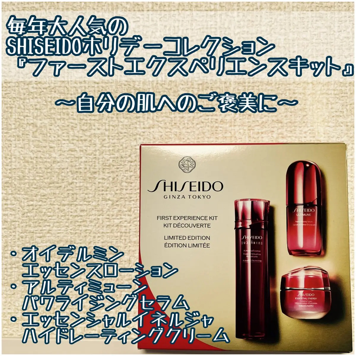 - 【2025クリスマスコフレ】〈数量限定〉 【内容】 ・SHISEIDOアルティミューン™ パワライジング セラム <美容液> 特製サイズ(15mL) ・SHISEIDO オイデルミン エッセンスローション <化粧液> 特製サイズ(30mL) ・SHISEIDOエッセンシャルイネルジャ ハイドレーティング クリーム <クリーム> 特製サイズ(15g) 2025年11月1日(土)発売