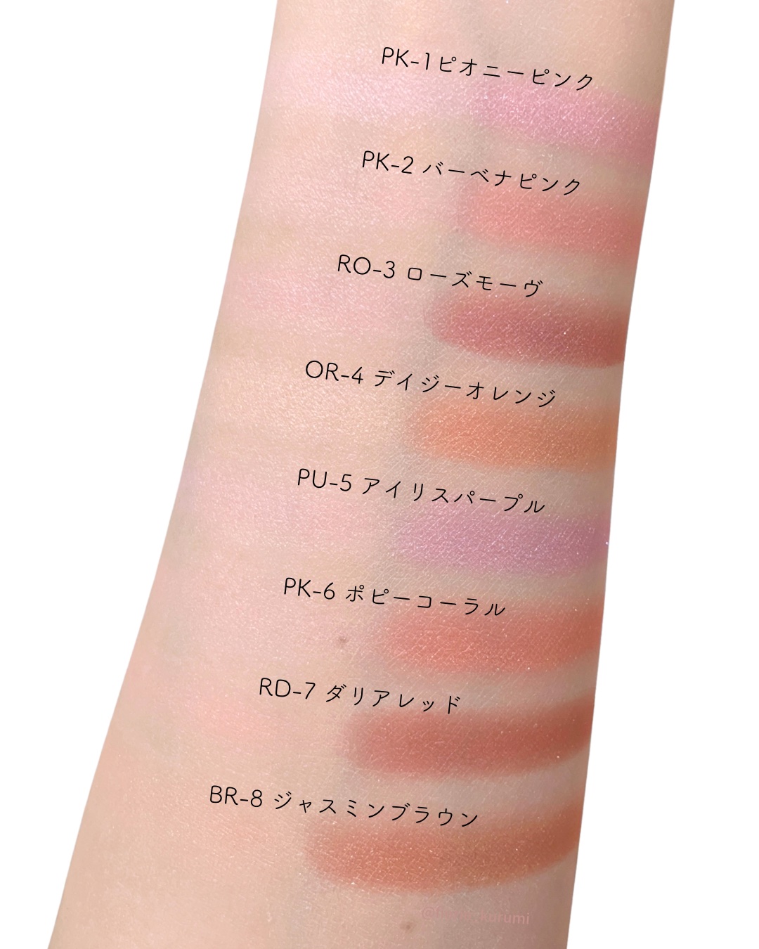 - <BR-8 ジャスミンブラウン> ジメチコン、ホウケイ酸(Ca/Al)、合成フルオロフロゴパイト、PET、窒化ホウ素、シリカ、水添ポリイソブテン、ジカプリン酸PG、ワセリン、ミネラルオイル、(ジメチコン/ビニルジメチコン)クロスポリマー、タルク、デシルテトラデカノール、リンゴ酸ジイソステアリル、ナイロン-12、トコフェロール、ヒアルロン酸Na、水溶性コラーゲン、DPG、(PEG-15/ラウリルジメチコン)クロスポリマー、(ビニルジメチコン/ラウリルジメチコン)クロスポリマー、アミノプロピルトリエトキシシラン、アモジメチコン、イソドデカン、エチルセルロース、エチルヘキサン酸セチル、オクチルドデカノール、クエン酸Na、ジメチコノール、スクワラン、テトラエチルヘキサン酸ペンタエリスリチル、トリエチルヘキサノイン、ハイドロゲンジメチコン、合成ワックス、酸化スズ、水、水酸化Al、フェノキシエタノール、グンジョウ、マイカ、酸化チタン、酸化亜鉛、酸化鉄、赤226 <OR-4 デイジーオレンジ> ジメチコン、ホウケイ酸(Ca/Al)、合成フルオロフロゴパイト、PET、窒化ホウ素、シリカ、水添ポリイソブテン、ジカプリン酸PG、ワセリン、ミネラルオイル、(ジメチコン/ビニルジメチコン)クロスポリマー、タルク、デシルテトラデカノール、リンゴ酸ジイソステアリル、ナイロン-12、トコフェロール、ヒアルロン酸Na、水溶性コラーゲン、DPG、(PEG-15/ラウリルジメチコン)クロスポリマー、(ビニルジメチコン/ラウリルジメチコン)クロスポリマー、アミノプロピルトリエトキシシラン、アモジメチコン、イソドデカン、エチルセルロース、エチルヘキサン酸セチル、オクチルドデカノール、クエン酸Na、ジメチコノール、スクワラン、テトラエチルヘキサン酸ペンタエリスリチル、トリエチルヘキサノイン、ハイドロゲンジメチコン、合成ワックス、酸化スズ、水、水酸化Al、フェノキシエタノール、グンジョウ、マイカ、酸化チタン、酸化亜鉛、酸化鉄、黄4、赤226 <PK-1 ピオニーピンク> ジメチコン、ホウケイ酸(Ca/Al)、合成フルオロフロゴパイト、窒化ホウ素、水添ポリイソブテン、PET、シリカ、ジカプリン酸PG、ワセリン、ミネラルオイル、(ジメチコン/ビニルジメチコン)クロスポリマー、タルク、デシルテトラデカノール、リンゴ酸ジイソステアリル、ナイロン-12、トコフェロール、ヒアルロン酸Na、水溶性コラーゲン、DPG、(PEG-15/ラウリルジメチコン)クロスポリマー、(ビニルジメチコン/ラウリルジメチコン)クロスポリマー、アミノプロピルトリエトキシシラン、アモジメチコン、イソドデカン、エチルセルロース、エチルヘキサン酸セチル、オクチルドデカノール、クエン酸Na、ジメチコノール、スクワラン、テトラエチルヘキサン酸ペンタエリスリチル、トリエチルヘキサノイン、ハイドロゲンジメチコン、合成ワックス、酸化スズ、水、水酸化Al、フェノキシエタノール、グンジョウ、マイカ、酸化チタン、酸化亜鉛、酸化鉄、赤226 <PK-2 バーベナピンク> ジメチコン、ホウケイ酸(Ca/Al)、合成フルオロフロゴパイト、窒化ホウ素、水添ポリイソブテン、PET、シリカ、ジカプリン酸PG、ワセリン、ミネラルオイル、(ジメチコン/ビニルジメチコン)クロスポリマー、タルク、デシルテトラデカノール、リンゴ酸ジイソステアリル、ナイロン-12、トコフェロール、ヒアルロン酸Na、水溶性コラーゲン、DPG、(PEG-15/ラウリルジメチコン)クロスポリマー、(ビニルジメチコン/ラウリルジメチコン)クロスポリマー、アミノプロピルトリエトキシシラン、アモジメチコン、イソドデカン、エチルセルロース、エチルヘキサン酸セチル、オクチルドデカノール、クエン酸Na、ジメチコノール、スクワラン、テトラエチルヘキサン酸ペンタエリスリチル、トリエチルヘキサノイン、ハイドロゲンジメチコン、合成ワックス、酸化スズ、水、水酸化Al、フェノキシエタノール、グンジョウ、マイカ、酸化チタン、酸化亜鉛、酸化鉄、黄4、赤202、赤226 <PK-6 ポピーコーラル> ジメチコン、ホウケイ酸(Ca/Al)、合成フルオロフロゴパイト、PET、窒化ホウ素、シリカ、水添ポリイソブテン、ジカプリン酸PG、ワセリン、ミネラルオイル、(ジメチコン/ビニルジメチコン)クロスポリマー、タルク、デシルテトラデカノール、リンゴ酸ジイソステアリル、ナイロン-12、トコフェロール、ヒアルロン酸Na、水溶性コラーゲン、DPG、(PEG-15/ラウリルジメチコン)クロスポリマー、(ビニルジメチコン/ラウリルジメチコン)クロスポリマー、アミノプロピルトリエトキシシラン、アモジメチコン、イソドデカン、エチルセルロース、エチルヘキサン酸セチル、オクチルドデカノール、クエン酸Na、ジメチコノール、スクワラン、テトラエチルヘキサン酸ペンタエリスリチル、トリエチルヘキサノイン、ハイドロゲンジメチコン、合成ワックス、酸化スズ、水、水酸化Al、フェノキシエタノール、グンジョウ、マイカ、酸化チタン、酸化亜鉛、酸化鉄、黄4、赤202、赤226 <PU-5 アイリスパー