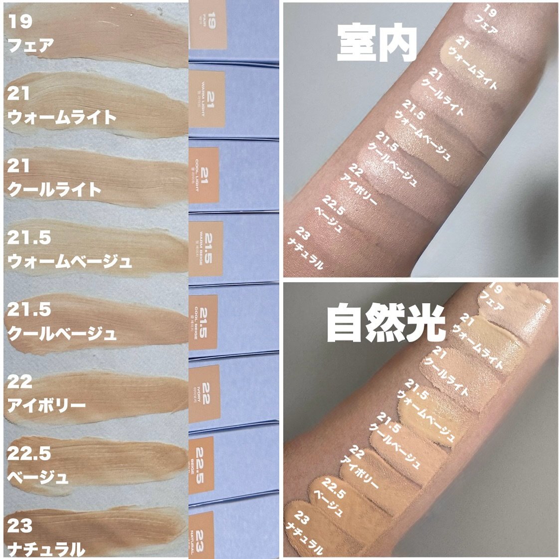 - < 21.5C クールベージュ> 酸化チタン、精製水、シクロペンタシロキサン、ブチレングリコール、フェニルトリメチコン、温泉水、グリセリン、イソドデカン、ポリグリセリル-4ジアイソステアレート/ ボリヒドロキシステアレート/セバケート、ジカプリル酸カーボネート、ブチルオクチルサリチレート、ナイアシンアミド、ラウリルPEG-9ポリジメチルシロキシエチルジメチコン、ジアイソステアリルマレート、トリメチルシロキシシリケート、酸化鉄(黄)、マイカ、塩化ナトリウム、プロパンジオール、アルミニウム水酸化物、ジメチコン、PEG-10ジメチコン、トリエトキシカプリリルシラン、硫酸パリウム、ジステアジモニウムヘクトライト、ソルビタンイソステアレート、ポリヒドロキシステアリン酸、ステアリン酸、カプリリルメチコン、酸化鉄(赤)、カプリリルグリコール、カプリル酸/カプリン酸トリグリセリド、グリセリルカプリレート、ポリソルベート80、ジナトリウムステアロイルグルタミン酸、エチルヘキシルグリセリン、水素添加レシチン、トリナトリウムエチレンジアミンジイソシネート、酸化鉄(黒)、イソステアリン酸、アデノシン、レシチン、ペンチレングリコール、ポリグリセリル-3ポリリシノレート、コラーゲンアミノ酸、1,2-ヘキサンジオール、ヘマトコッカスプルビアリスエキス、加水分解ヒアルロン酸、ヒアルロン酸、ヒアルロン酸Na、トコフェロール、グアイアズレンスルホネートNa、ジメチルシラノールヒアルロン酸、加水分解ヒアルロン酸Na、ヒドロキシプロピルトリモニウムヒアルロン酸、ヒアルロン酸Naクロスポリマー、ジメチルシラノールビアルロン酸Na、アセチル化ヒアルロン酸Na <19 フェア> 精製水、酸化チタン、シクロペンタシロキサン、ブチレングリコール、フェニルトリメチコン、温泉水、グリセリン、イソドデカン、ポリグリセリル-4ジアイソステアレート/ ボリヒドロキシステアレート/セバケート、ジカプリル酸カーポネート、ブチルオクチルサリチレート、ナイアシンアミド、ラウリルPEG-9ポリジメチルシロキシエチルジメチコン、ジアイソステアリルマレート、トリメチルシロキシシリケート、マイカ、塩化ナトリウム、プロパンジオール、アルミニウム水酸化物、酸化鉄(黄)、PEG-10ジメチコン、硫酸バリウム、ジステアジモニウムヘクトライト、ソルビタンイソステアレート、トリエトキシカプリリルシラン、ジメチコン、ポリヒドロキシステアリン酸、ステアリン酸、カプリリルグリコール、カプリル酸/カプリン酸トリグリセリド、カプリリルメチコン、グリセリルカプリレート、酸化鉄(赤)、ポリソルペート80、ジナトリウムステアロイルグルタミン酸、エチルヘキシルグリセリン、水素添加レシチン、トリナトリウムエチレンジアミンジイソシネート、イソステアリン酸、アデノシン、酸化鉄(黒)、レシチン、ペンチレングリコール、ポリグリセリル-3ポリリシノレート、コラーゲンアミノ酸、1,2-ヘキサンジオール、ヘマトコカスプルビアリスエキス、加水分解ヒアルロン酸、ヒアルロン酸、ヒアルロン酸ナトリウム、トコフェロール、グアイアズレンスルホネートナトリウム、ジメチルシラノールヒアルロン酸、加水分解ナトリウムヒアルロン酸、ヒドロキシプロピルトリモニウムヒアルロン酸、ヒアルロン酸ナトリウムクロスポリマー、ジメチルシラノールヒアルロン酸ナトリウム、アセチル化ヒアルロン酸ナトリウム <21.5W ウォームベージュ> 酸化チタン、精製水、シクロペンタシロキサン、ブチレングリコール、フェニルトリメチコン、温泉水、グリセリン、イソドデカン、ポリグリセリル-4ジアイソステアレート/ ポリヒドロキシステアレート/セバケート、ジカプリル酸カーボネート、ブチルオクチルサリチレート、ナイアシンアミド、ラウリルPEG-9ポリジメチルシロキシエチルジメチコン、酸化鉄(黄)、ジアイソステアリルマレート、トリメチルシロキシシリケート、マイカ、ジメチコン、塩化ナトリウム、プロパンジオール、アルミニウム水酸化物、PEG-10ジメチコン、トリエトキシカプリリルシラン、硫酸パリウム、ジステアジモニウムヘクトライト、ソルビタンイソステアレート、ポリヒドロキシステアリン酸、ステアリン酸、カプリリルメチコン、カプリリルグリコール、酸化鉄(赤)、カプリル酸/カプリン酸トリグリセリド、グリセリルカプリレート、ポリソルベート80、ジナトリウムステアロイルグルタミン酸、エチルヘキシルグリセリン、水素添加レシチン、酸化鉄(黒)、トリナトリウムエチレンジアミンジ酢酸、イソステアリン酸、アデノシン、レシチン、ペンチレングリコール、ポリグリセリル-3ポリリシノレート、コラーゲンアミノ酸、1,2-ヘキサンジオール、ヘマトコッカスプルビアリスエキス、加水分解ヒアルロン酸、ヒアルロン酸、ヒアルロン酸Na、トコフェロール、グアイアズレンスルホネートNa、ジメチルシラノールヒアルロン酸、加水分解ヒアルロ