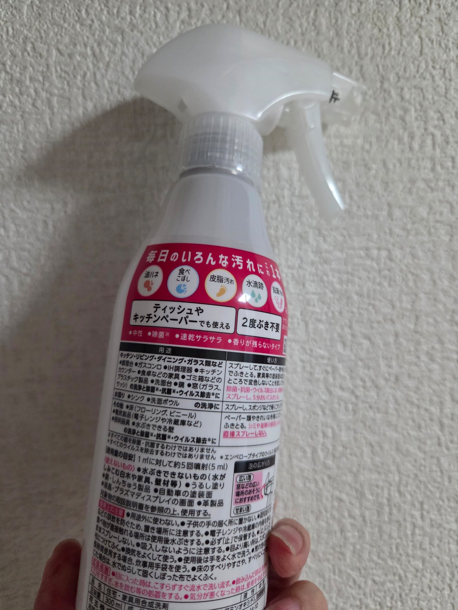 毎日の汚れ、菌、ウイルスこれ一本でスッキリ。 色々な箇所をサッと拭く事ができる便利、うちは特に食卓ねテーブルとガスコンロの油汚れに使用しています。 ベタつかずに拭いてすぐ乾く。 窓や冷蔵庫とかゴミ箱とか縦型のものには、泡で出てくるから液ダレしないのはいいですよ。 二度拭きいらずでサラの仕上がりだから、すぐその上歩けますよ。