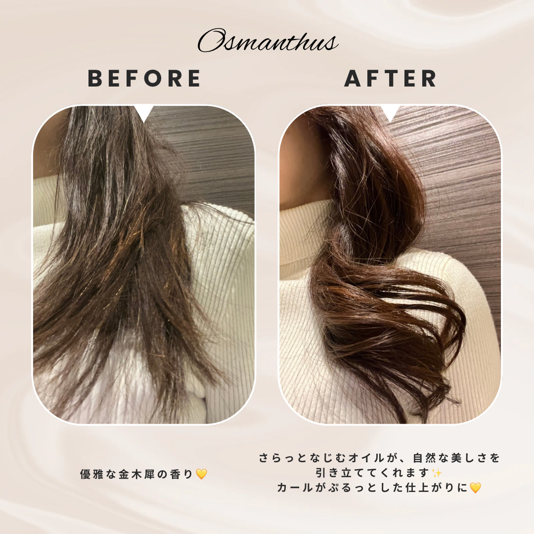 - パフュームグレードの香り3種類と髪の太さ、ダメージなどに応じて選べるパーソナルヘアオイル。 Osmanthusはダメージヘア、剛毛、広がるも毛先までしっとりまとまり、ぷりぷりしてつややかな髪に仕上げます。