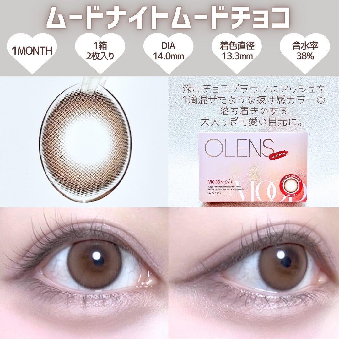 - 韓国カラコン業界の話題のブランド『OLENS(オーレンズ)』の日本正式承認商品シリーズ。 世界中から注目を浴びるグループ「NewJeans (ニュージーンズ)」がイメージモデル。 OLENSから待望の新シリーズ「Moodnight(ムードナイト)」が新発売しました! 透明感と儚げな印象を与えるアッシュカラーで、グラデーションフチなので瞳に奥行きを与え大人っぽい目元を演出。 自然に馴染む13.3mmの着色直径でほのかに瞳の印象を変える裸眼風なナチュラルカラコンです。 シーンを選ばず誰でも使いやすいのでナチュラルカラコン好きにお勧めのシリーズです! ■OLENS Moodnight(オーレンズムードナイト) ・枚数:1箱10枚入り ・カラー :全2色 ■使い方 コンタクトレンズは高度管理医療機器です。必ず眼科医の処方に従って購入してください。 ■使用上の留意事項 コンタクトレンズは高度管理医療機器です。眼科医の指導に従い装用期間を厳守し、正しくお使いください。眼の定期検査を必ず受けてください。添付文書を必ず読み、取扱方法、装用時間を守って正しくお使いください。少しでも異常を感じたら、直ちに眼科医の検査を受けてください。