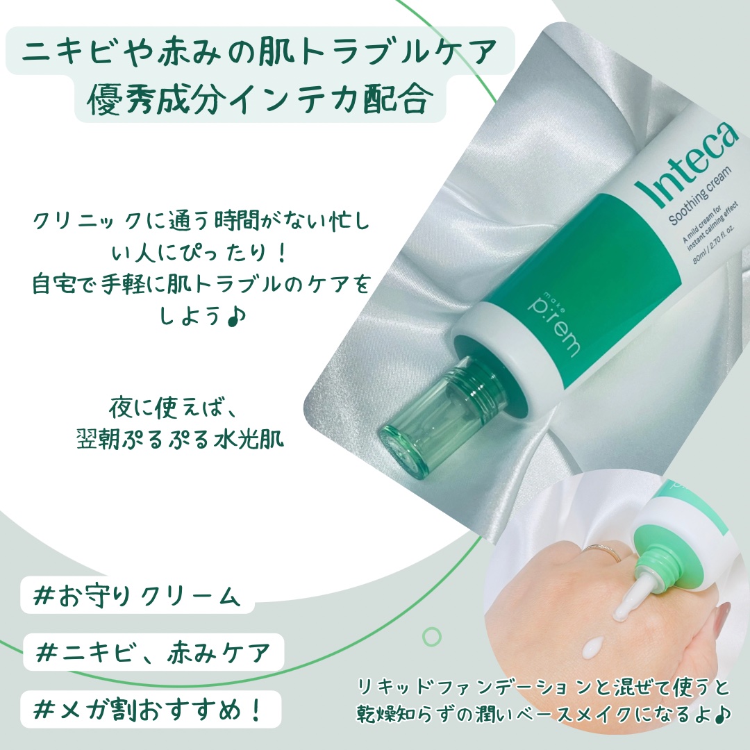 - 整肌効果を期待できるインテカスージングクリーム。独自製法をプラスして安定化したナノサイズのメイクプレムインテカ(INTECA)*を配合し、ツボクサの整肌成分を肌にたっぷりと浸透**させます。潤いたっぷりスージングテクスチャーで速やかに肌を整肌。 *整肌成分 **角質層まで 2025年10月11日(土)より全国のロフト*¹、PLAZA*¹、ハンズ*¹にて発売開始 *¹一部お取り扱いのない店舗がございます。