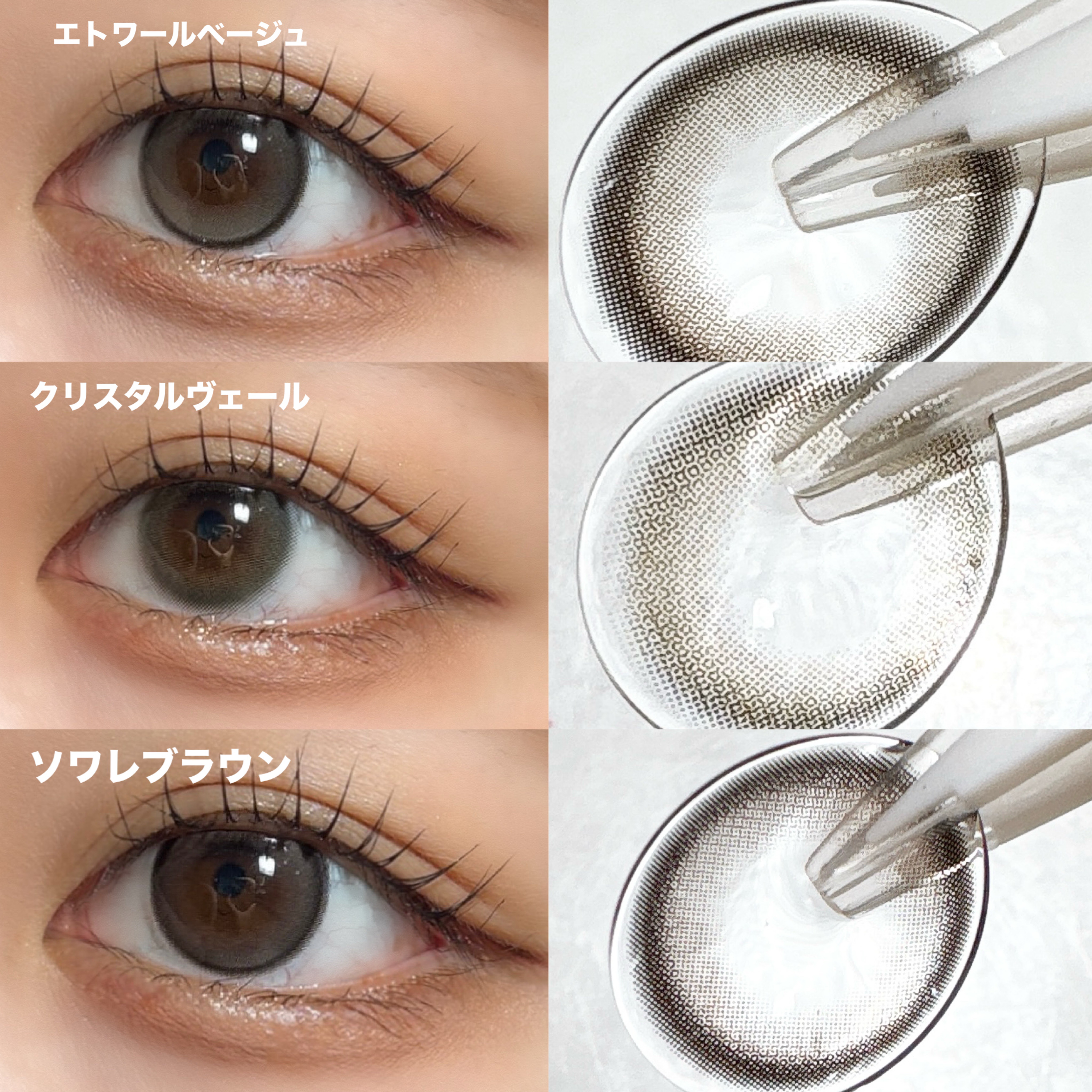 LENSSISのノイシリーズは、焦がしたキャラメルみたいなブラウンとキャメルのグラデーションが可愛いレンズです。 LENSSISのノイブラックは、しっかりブラックで瞳を大きく見せつつ、イエローのグラデーションが可愛いレンズです。 Chuu lensのCREAM GRAYは、イエベでも使えるベージュ寄りのグレーレンズです。 hapakristinのSecretive Kristin / Dusk brownは、濃いめの発色のほぼ黒に近いブラウンで瞳を大きく見せてくれて、グラデーションのブラウンで奥行きをプラスしてくれます。
