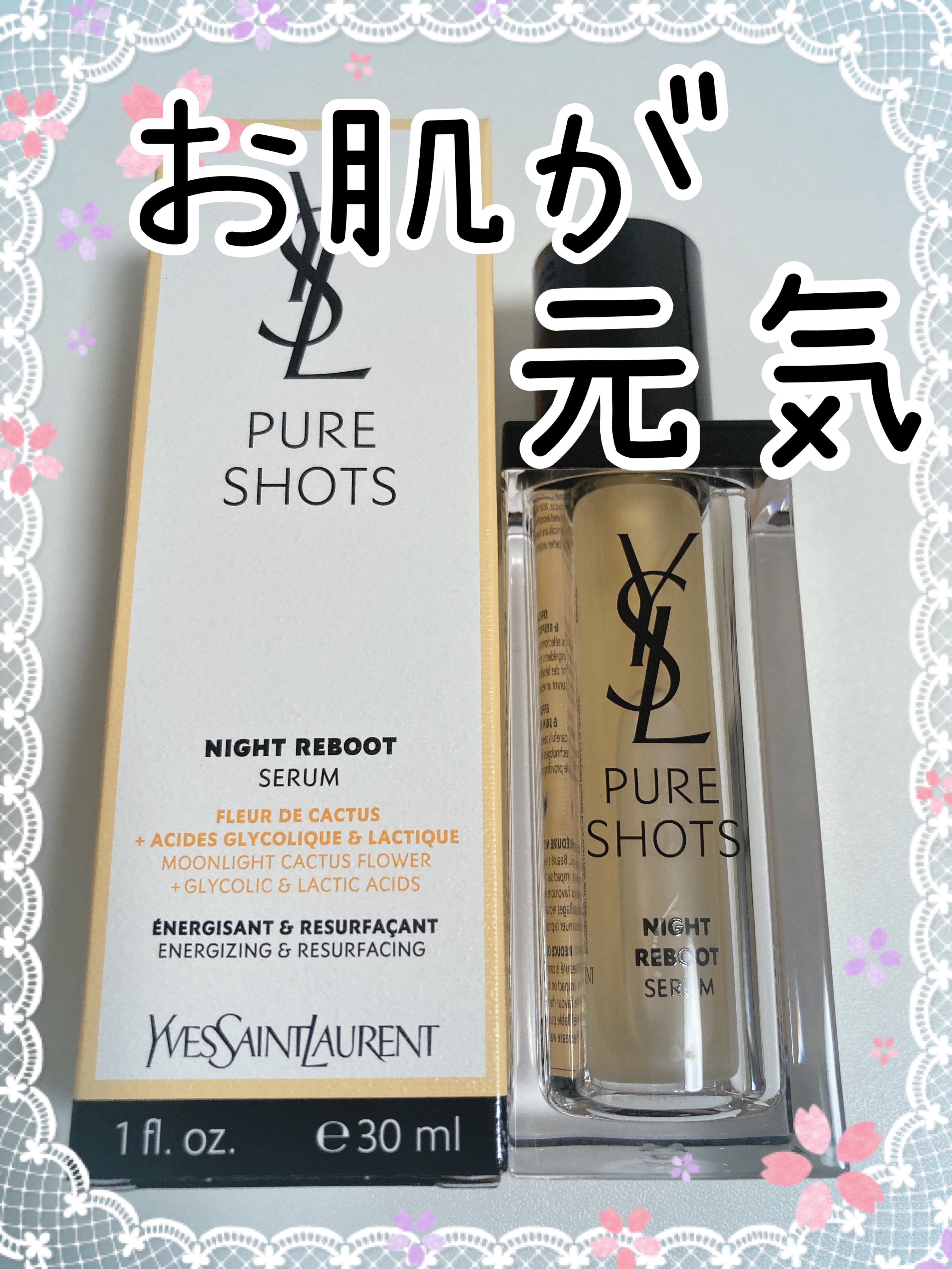 - YSL No.1美容液が進化。 翌朝出会う。8時間熟睡の美肌。 先進技術により、パワフルなボタニカルを約20倍*配合。 深夜24時から始まる、たったの1時間の「肌のピークタイム」に着目し、まるで8時間熟睡したように。 なめらかで透明感のある毛穴レスな肌印象へ。 *ピュアショット ナイトセラムとの比較 ※ 新製品「ピュアショット ナイト リチャージセラム」と旧製品「ピュアショット ナイトセラム」はサイズ規格が異なります。新製品のレフィルは旧製品のケースに入りませんので、ご留意ください。