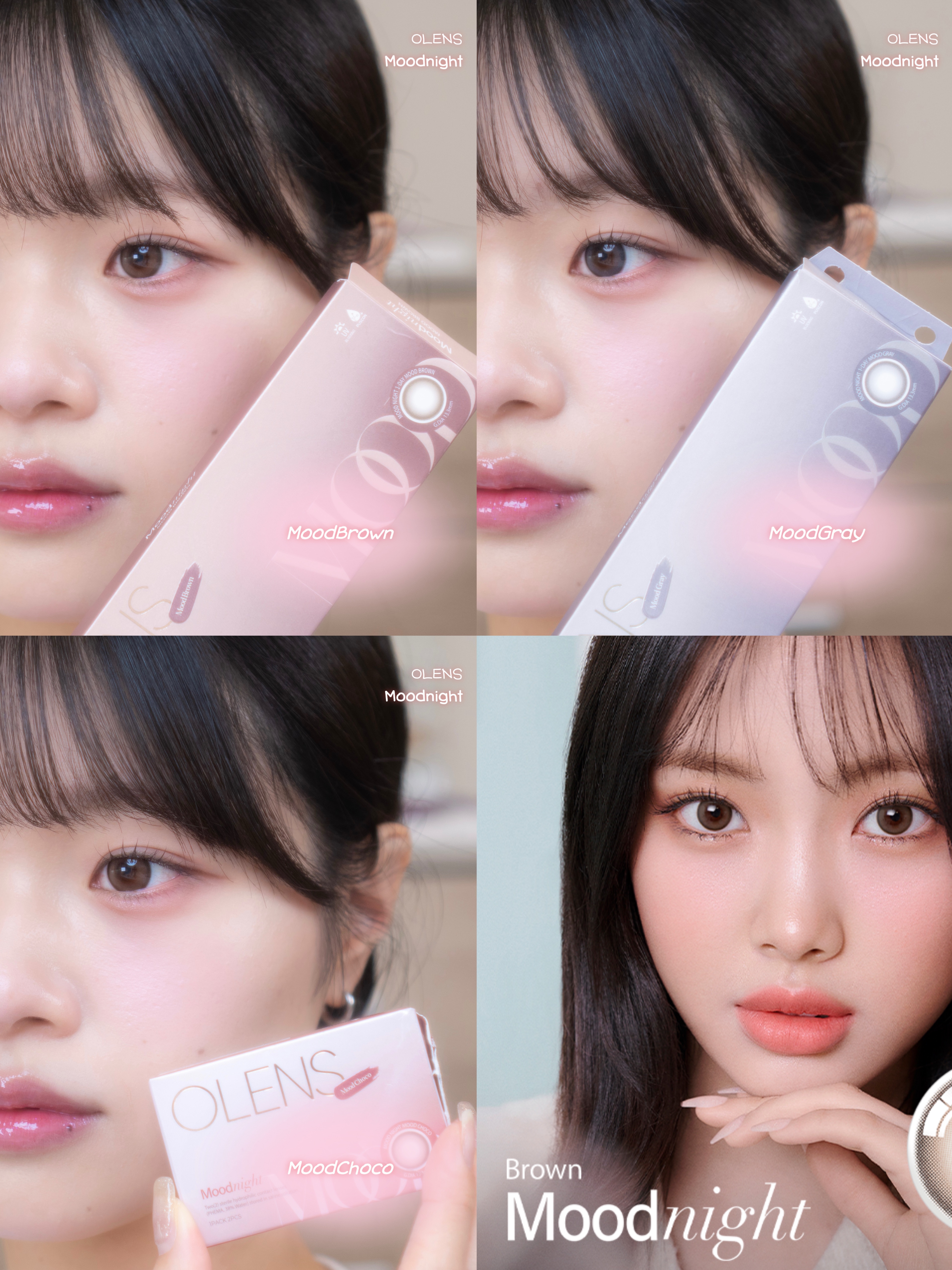 OLENS\Moodnightシリーズ/☑️Moodnight1MonthMoodChocoDIA14.0mm着色直径13.3mm含水率38%真ん中までふんわり溶け込むグラデーションフチとアッシュ感のあるカラーで雰囲気のある目元を演出。☑️M...