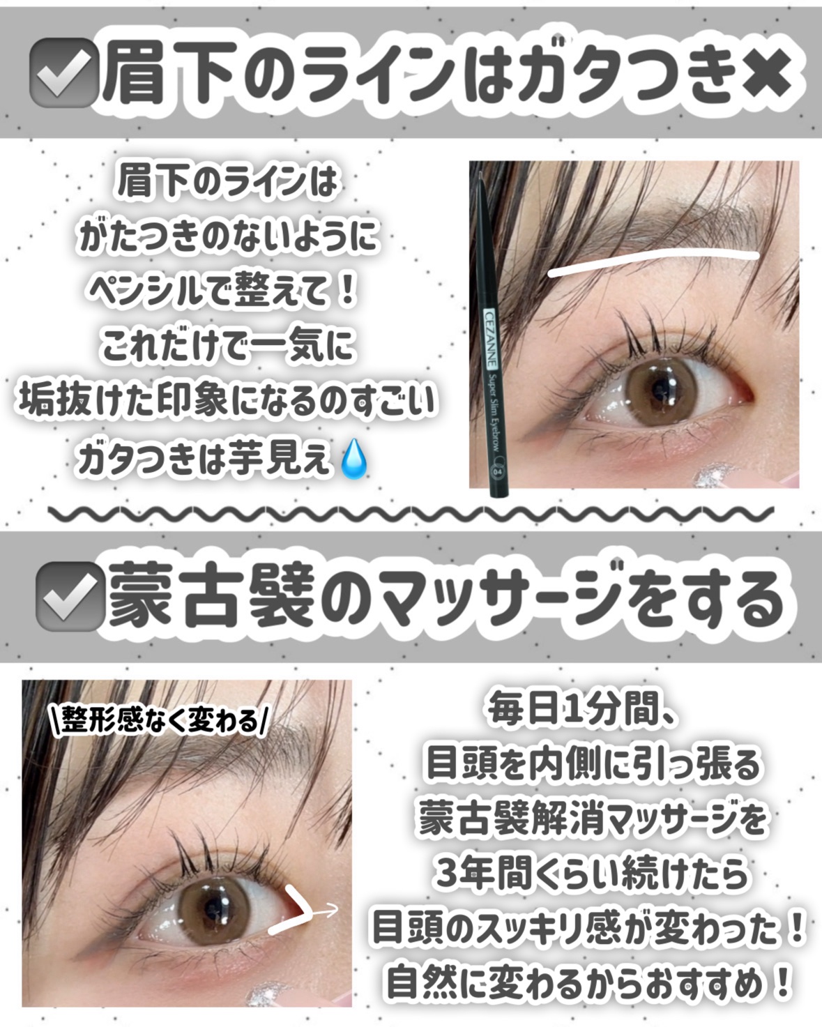 【瞼の筋トレ】について詳しく解説!!これさえすれば絶対変われます!!!瞼の筋トレって?という方は、画像をご覧下さい‼️これがないと私は今頃二重になってなかった…と言っても過言ではないくらい、私の癖付けには欠かせなかったものです!!今回は、昔からしている筋トレ1つと、最近思いついて実践している筋トレ2つをご紹介します!!どれもすごく簡単なので、ぜひ試してみてください📷Q 一日どのくらいしてた?A とにかく暇さえあればしていました!!1日30分の日もあれば、何時間もする日もありましたこの筋トレは、お風呂に入りながらや勉強しながら、スマホ見ながらでもできるのがいいところなので、スキマ時間を上手く活用するのがいいかな思います💭Q 今まで何回くらい筋肉痛になった?A 左右どちらも5回くらいだと思います!瞼が私より軽い方は、1、2回で十分スッキリすると思いますよ❣️Q どれくらいで筋肉痛になった?A 筋肉痛までは平均して2週間くらいかかりました!でもフォロワーさんの中には1日でなられた方も多くいらっしゃいますなのでその人の瞼や頑張り次第だと思います❣️Q 筋トレ1