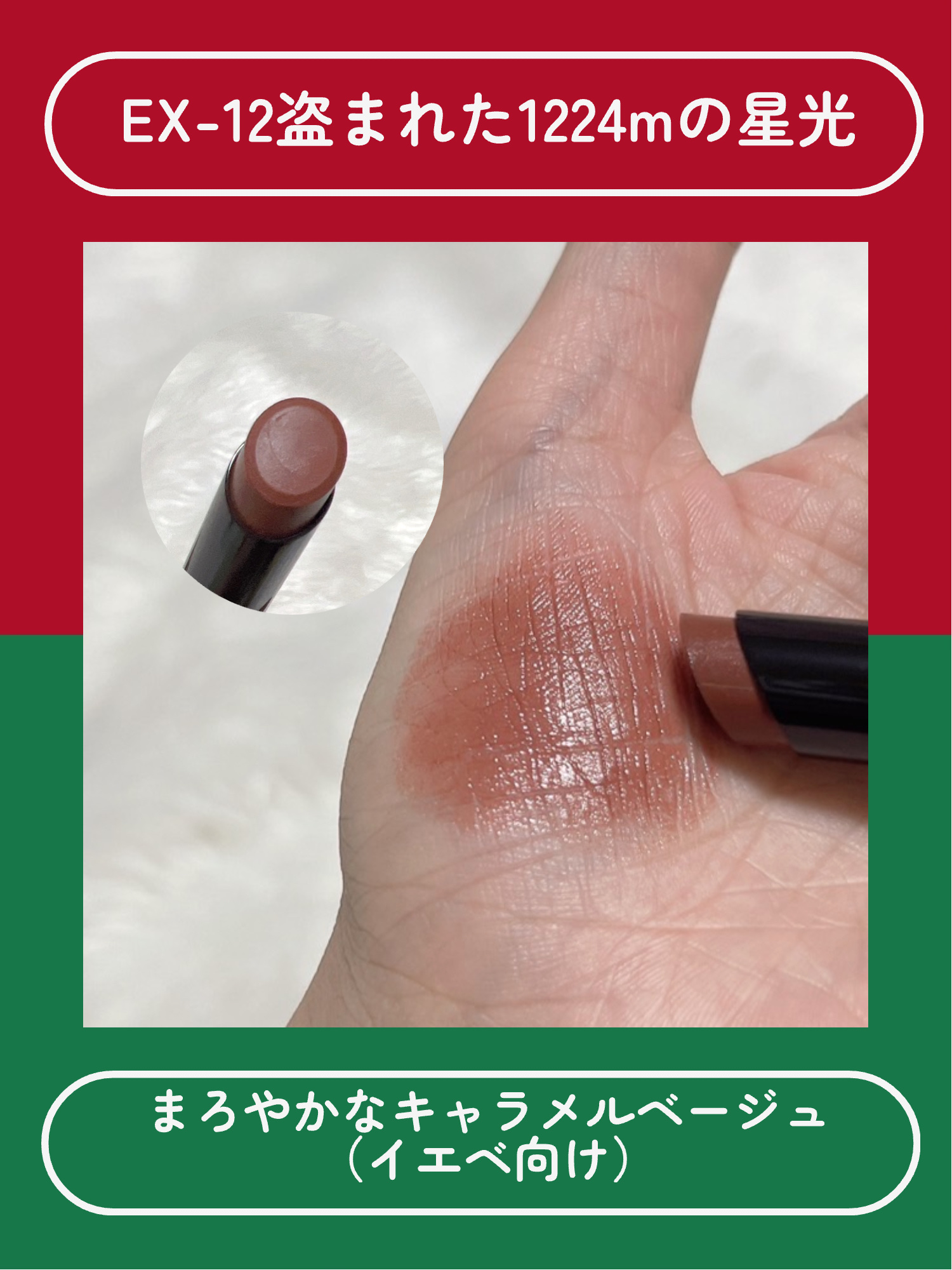 - 落ちにくさも美発色もよくばりたい、つけたての色が長時間持続する人気の口紅リップモンスター。 唇から蒸発する水分を活用して密着ジェル膜に変化する独自技術※で、つけたての色が長時間持続。 高発色&保湿。 ※当社独自の色持ち技術 ■花火のようにまぶしくきらめく 繊細なラメが際立つ限定色 EX-6 ピンクカラー×青ラメ【ロケット花火流星群】 EX-7 オレンジカラー×黄&緑ラメ【100万発の線香花火】 EX-8 レッドカラー×緑ラメ【打ち上げ花火ブランコ】 ■深みレッド系カラーの限定色 EX-9 戦慄の喜笑 (限定色) EX-10 狂気の怒号 (限定色) 【2025クリスマスコフレ】 落ちにくいリップモンスターから、唇の血色感を底上げする ホリデーシーズン限定の熱感ニュアンスベージュ系カラー登場。 EX-11 紅煙宿る贈り物(限定色):ボルドーベージュ系 EX-12 盗まれた1224mの星光(限定色):キャメルベージュ系
