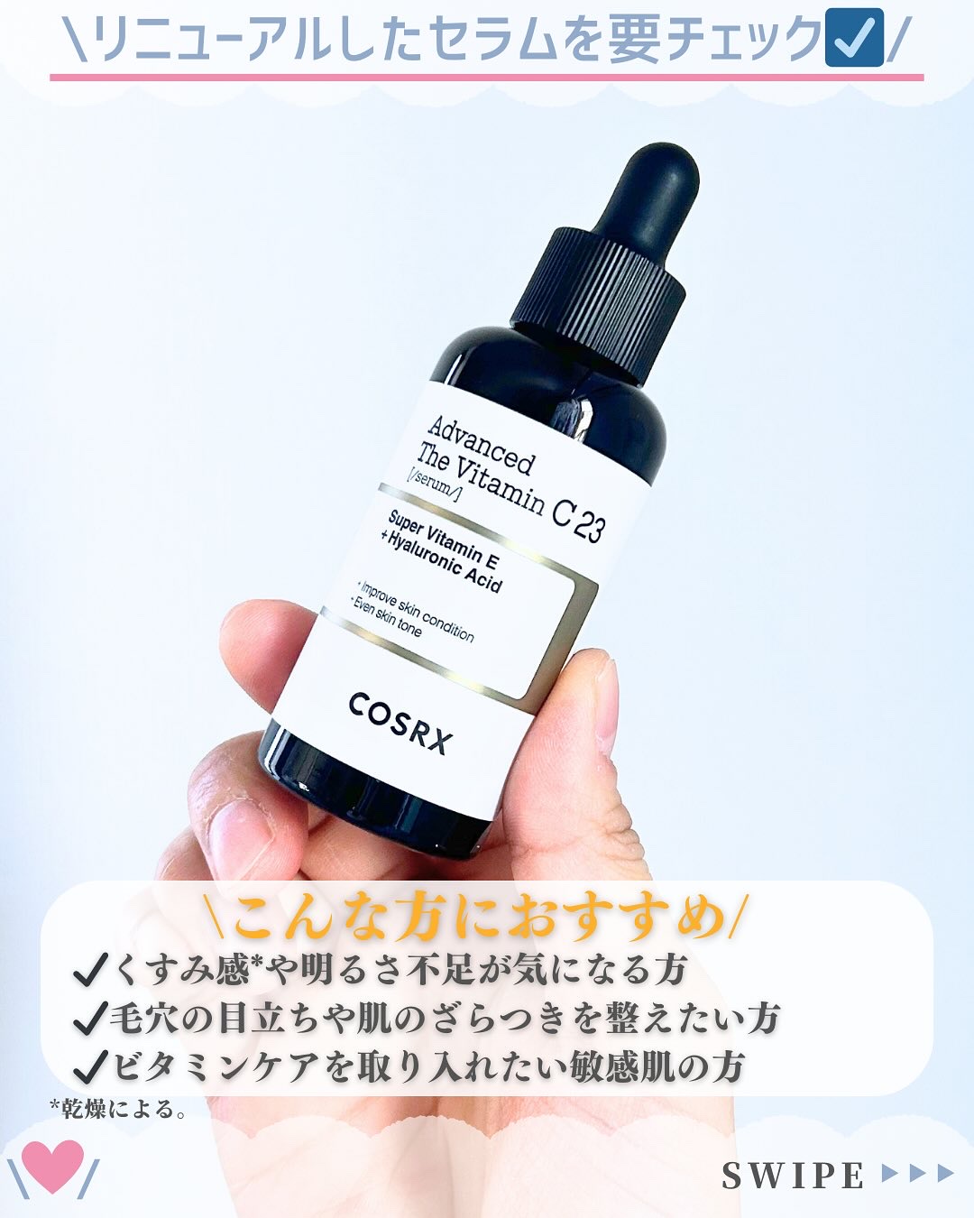 - COSRXの代表商品『RXザ・ビタミンC23セラム』が待望のリニューアル。 発売当初から話題であった原料特有の香りを排除し、香りが苦手だった方にもより使いやすく従来品から改善。 より低刺激な処方に変更。敏感肌さんや肌のコンディションが良くない時でも使用しやすくなりました。