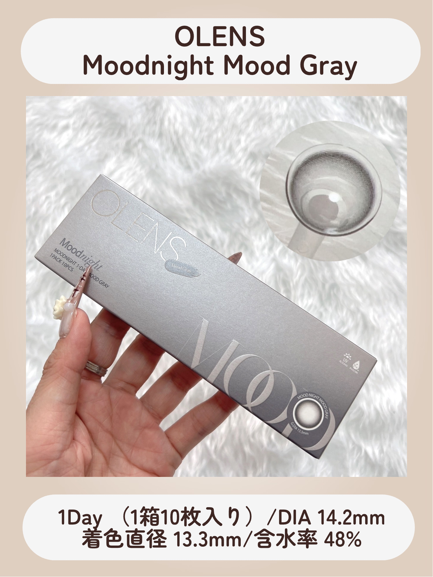 - 韓国カラコン業界の話題のブランド『OLENS(オーレンズ)』の日本正式承認商品シリーズ。 世界中から注目を浴びるグループ「NewJeans (ニュージーンズ)」がイメージモデル。 OLENSから待望の新シリーズ「Moodnight(ムードナイト)」が新発売しました! 透明感と儚げな印象を与えるアッシュカラーで、グラデーションフチなので瞳に奥行きを与え大人っぽい目元を演出。 自然に馴染む13.3mmの着色直径でほのかに瞳の印象を変える裸眼風なナチュラルカラコンです。 シーンを選ばず誰でも使いやすいのでナチュラルカラコン好きにお勧めのシリーズです! ■OLENS Moodnight(オーレンズムードナイト) ・枚数:1箱10枚入り ・カラー :全2色 ■使い方 コンタクトレンズは高度管理医療機器です。必ず眼科医の処方に従って購入してください。 ■使用上の留意事項 コンタクトレンズは高度管理医療機器です。眼科医の指導に従い装用期間を厳守し、正しくお使いください。眼の定期検査を必ず受けてください。添付文書を必ず読み、取扱方法、装用時間を守って正しくお使いください。少しでも異常を感じたら、直ちに眼科医の検査を受けてください。