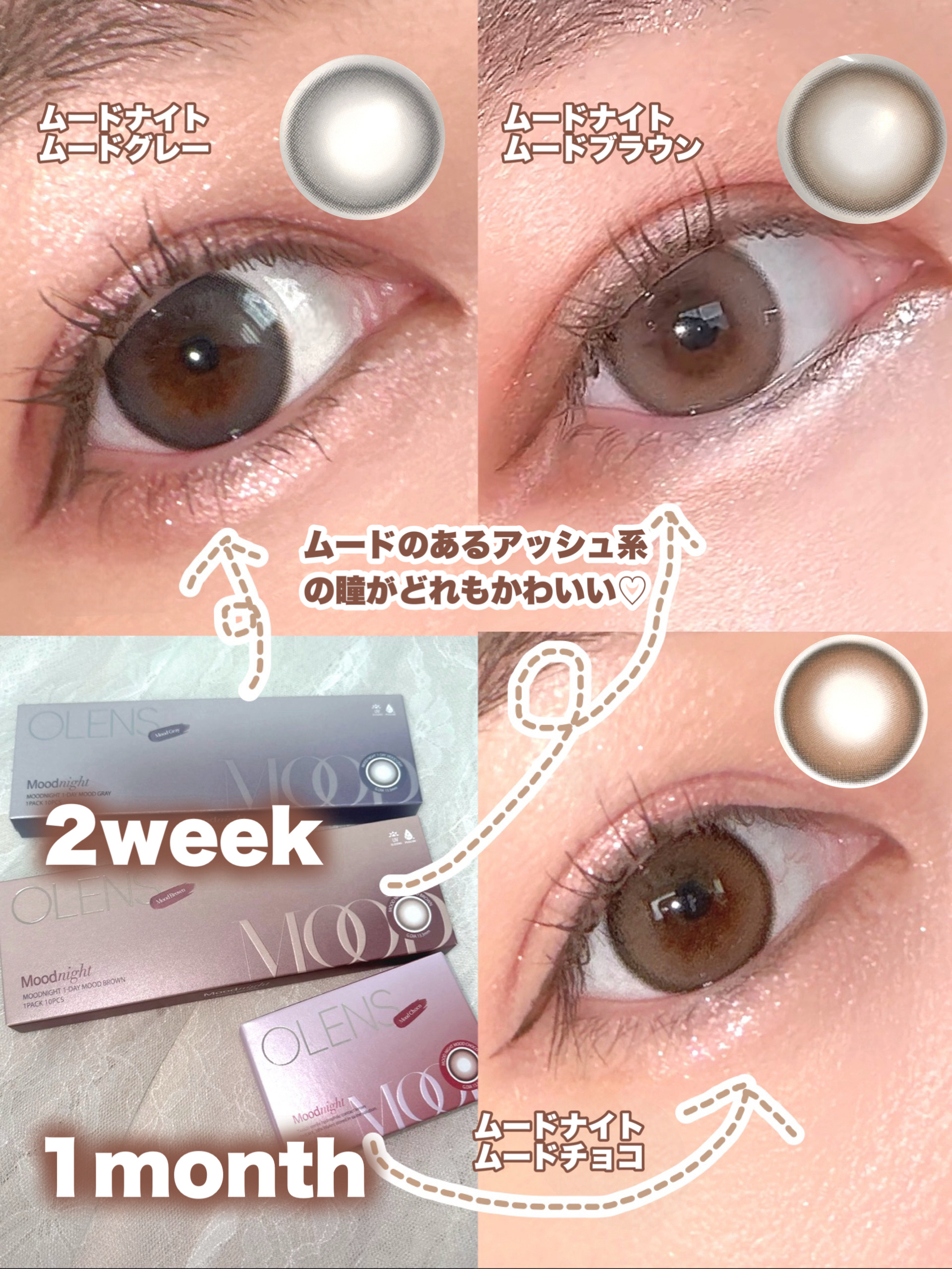 OLENS大人可愛いアッシュ系カラコン3選🤍真ん中までふんわり溶け込むグラデーションフチとアッシュ感のあるカラーで雰囲気のある目元を演出してくれます♩✔︎MoodnightMoodGray(1day)✔︎MoodnightMoodBrown(...