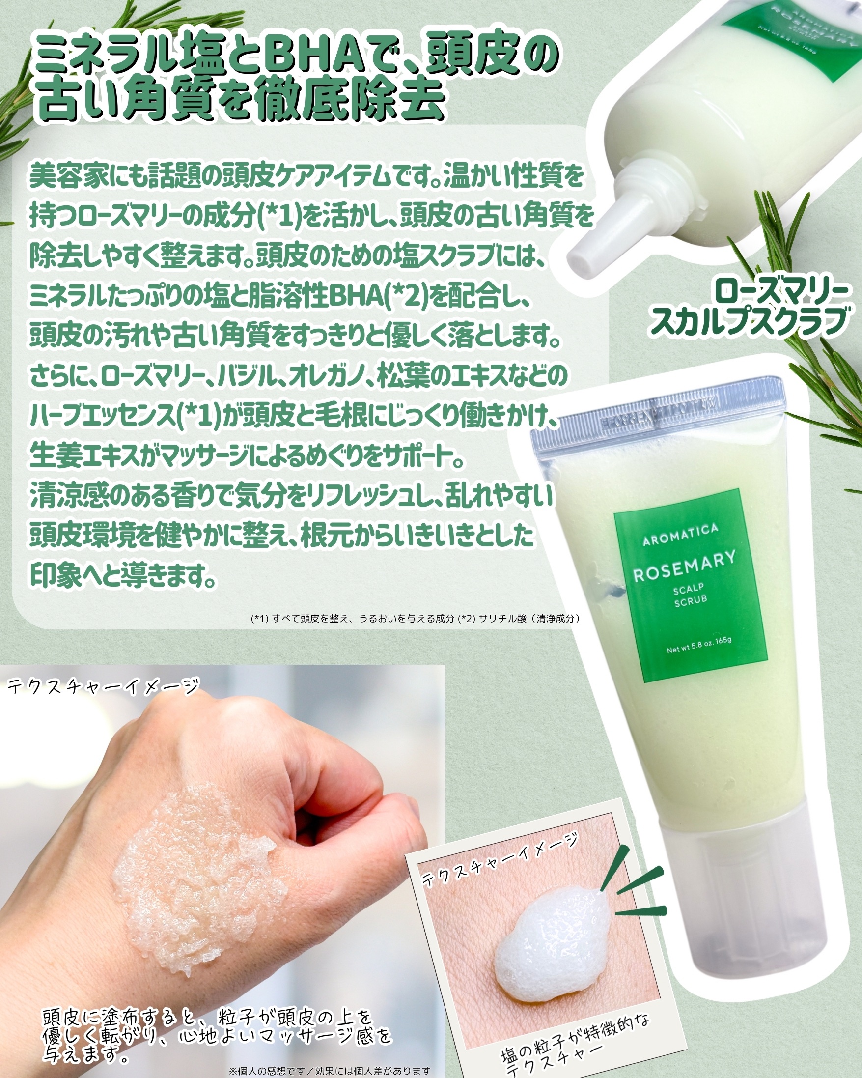 AROMATICAローズマリースカルプスクラブローズマリーの抗酸化効果で頭皮ケア🌿頭皮をすこやかに整えるハーブエッセンス✨頭皮のための塩スクラブ🧂ローズマリーとミネラルたっぷりの塩、脂溶性BHAが頭皮の汚れや古い角質をやさしく落とすスクラブな...