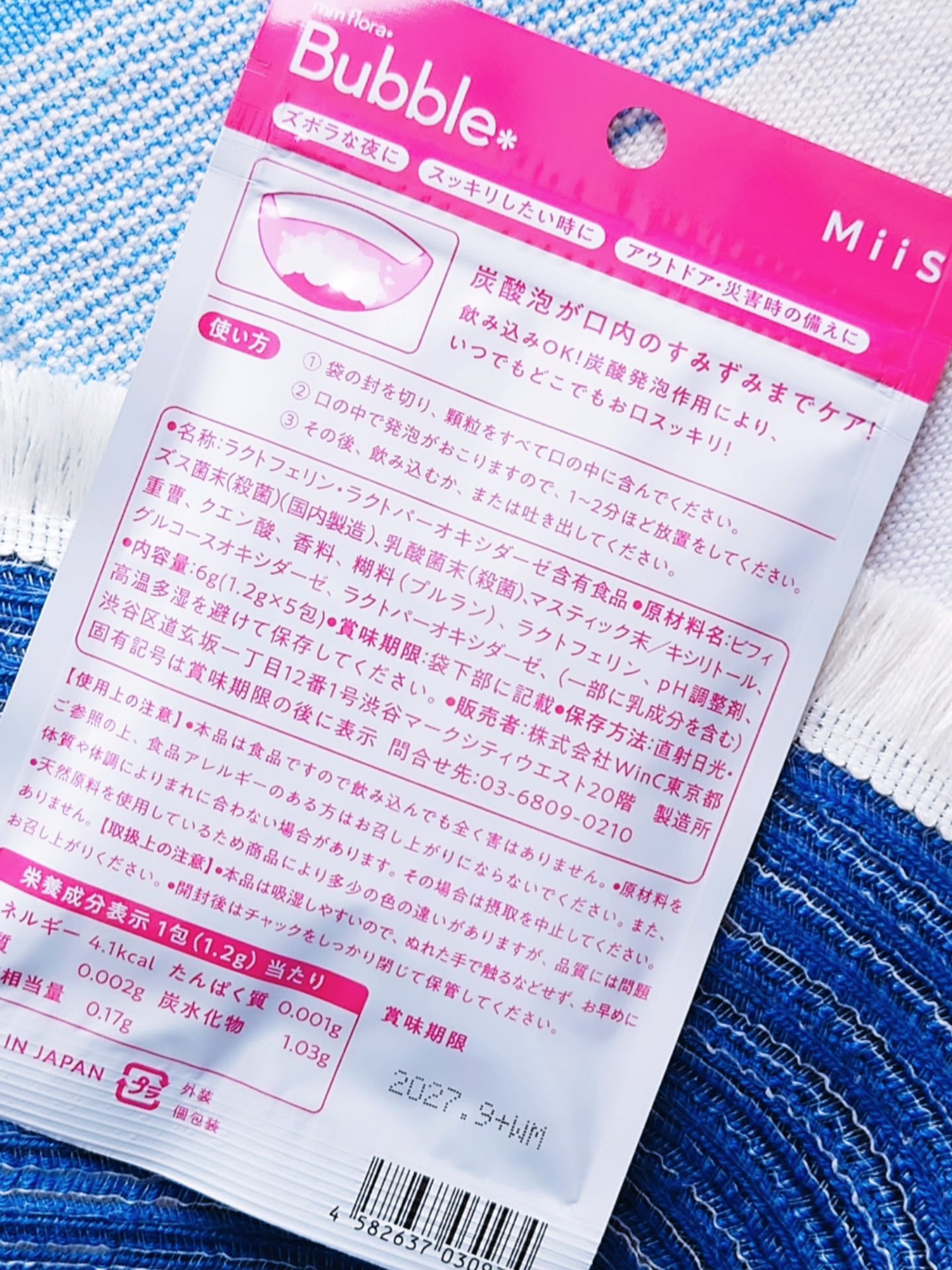 - <mm flora* bubble> 乳酸菌末(殺菌)、マスティック末、ビフィズス菌末(殺菌)/キシリトール、重曹、クエン酸、香料、糊料(プルラン)、ラクトフェリン、pH調整剤、グルコースオキシダーゼ、ラクトパーオキシダーゼ