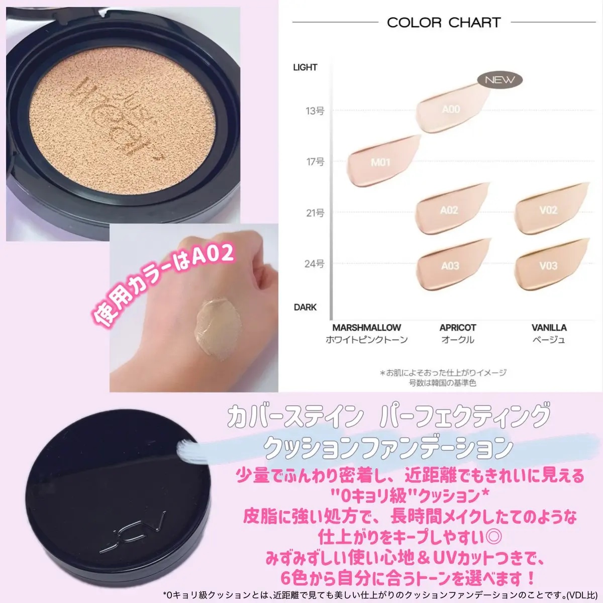 - SPF35・PA++ VDLで人気のファンデーション*1シリーズからクッションファンデーションが登場!! 24時間カバー*2 近距離でも美しく、0キョリ級クッション *1VDL カバーステイン パーフェクティング ファンデーション *2メイクアップカバー持続データ(小じわ、キメ、毛穴)韓国外部機関にて取得済み。効果には個人差があります。 Point1 崩れにくいロングラスティング効果 皮脂を吸着する多孔性シリカ*1と柔軟性があるポリマー*2配合。 メイクを維持し、崩れにくいカバー効果を与えます。 *1増量剤:シリカ *2皮膜形成剤:トリメチルシロキシケイ酸 Point2 0キョリ級クッション 少量ワンタッチで肌悩みを密着カバー!ソフトフォーカス効果*で肌全体をきれいにカバーし、近距離でもハリのあるなめらかでつるんとした肌を演出。 *光の散乱によって毛穴やシワを目立たなくみせる効果のこと Point3 もちふわパフ+シックなデザイン 薄くて柔らかく、肌に密着。 指にフィットする柔らかい素材&卵型なので、たたきやすく小鼻の隅々まで塗りやすい!きめ細かなコントロールが可能。 高級感あるオールブラックのデザインですっきりとした印象へ Point4 みずみずしく保つヴィーガンファンデーション*1&紫外線防止効果 ソルビトールから発酵工法で得られた天然保湿高分子*2配合。 水分を抱え込みみずみずしく保つ*3 。 SPF35・PA++の紫外線防止効果も! *1韓国ヴィーガン認証院認証 *2整肌成分:ビオサッカリドガムー1 *3スキンケア効果による