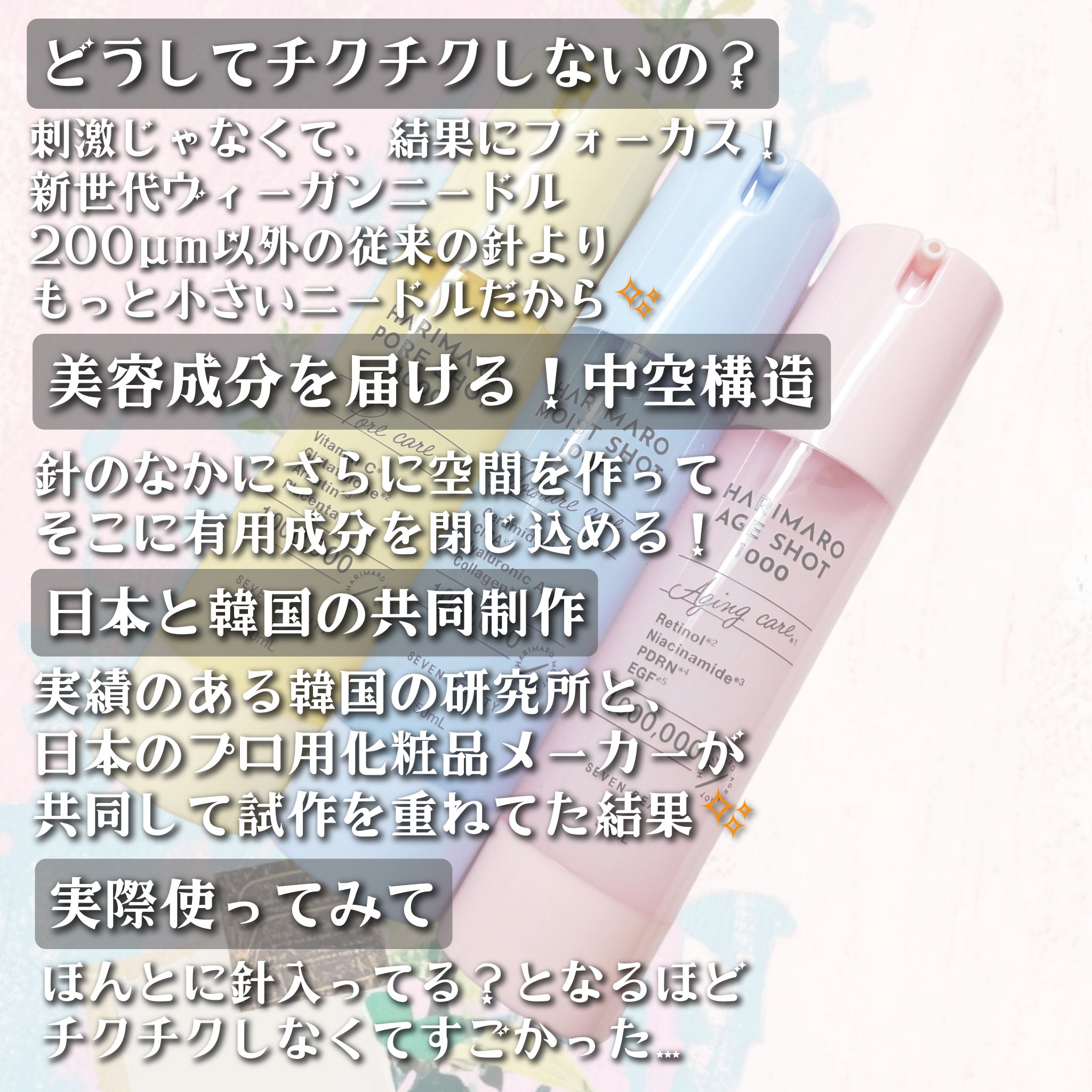 肌悩み別に合わせて使い分け🩷💛🩵𓊆ྀིハリマロ𓊇ྀི✔︎モイストショット1000🩵✔︎ポアショット1000💛✔︎エイジショット1000🩷𝟭𝟭/𝟭⸜𝓝𝓮𝔀⸝刺激に頼らない、新世代ヴィーガンニードル美容液※導入美容液なので洗顔後すぐの使用⚠️ ✎...